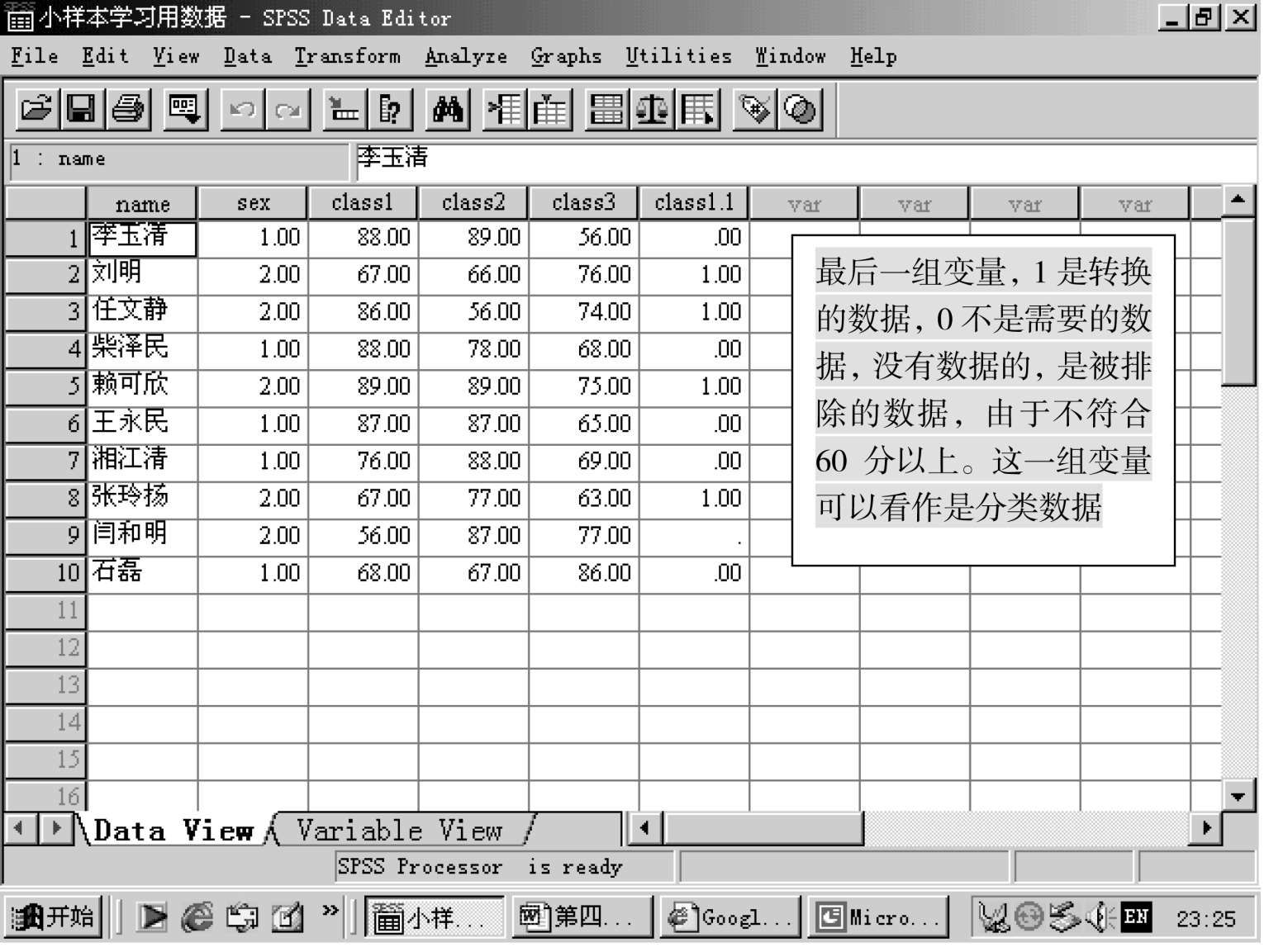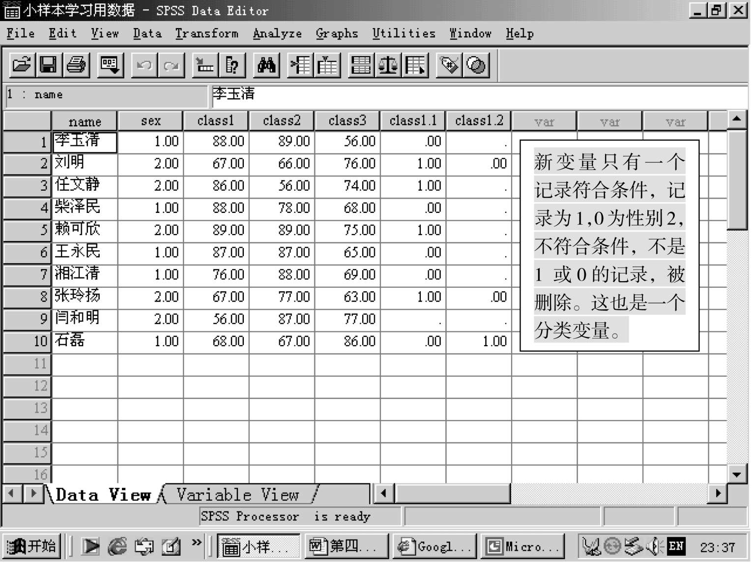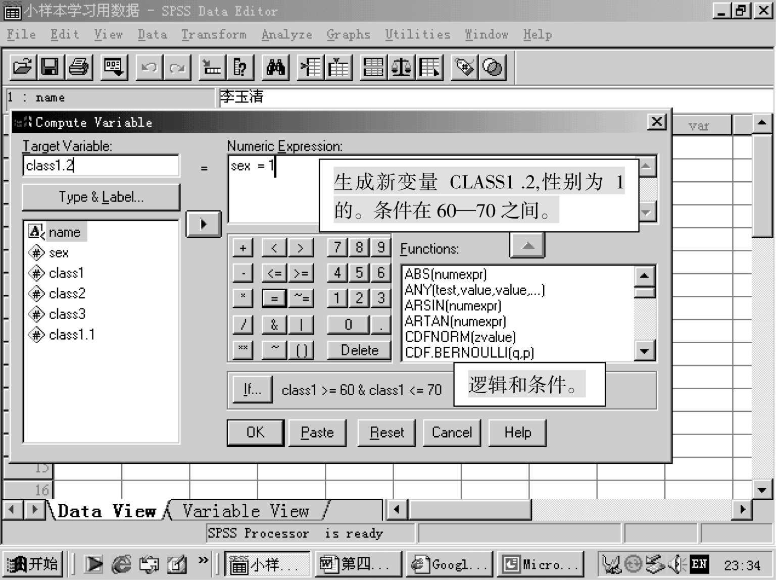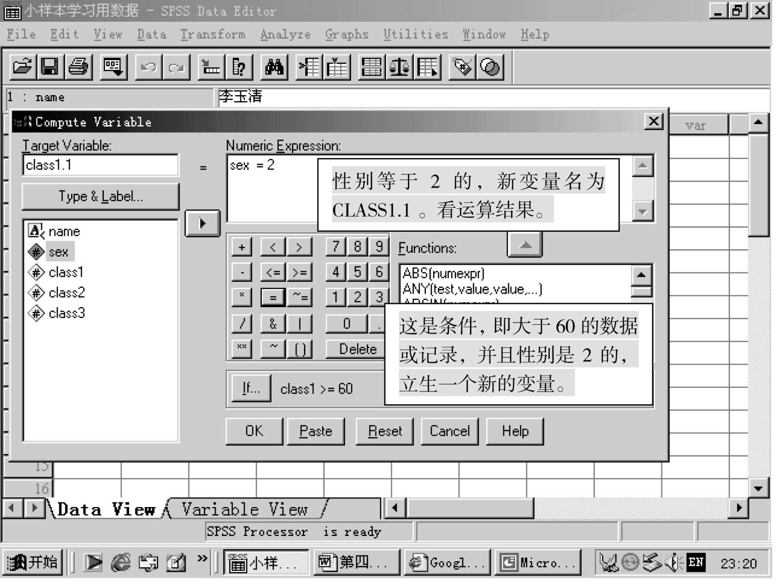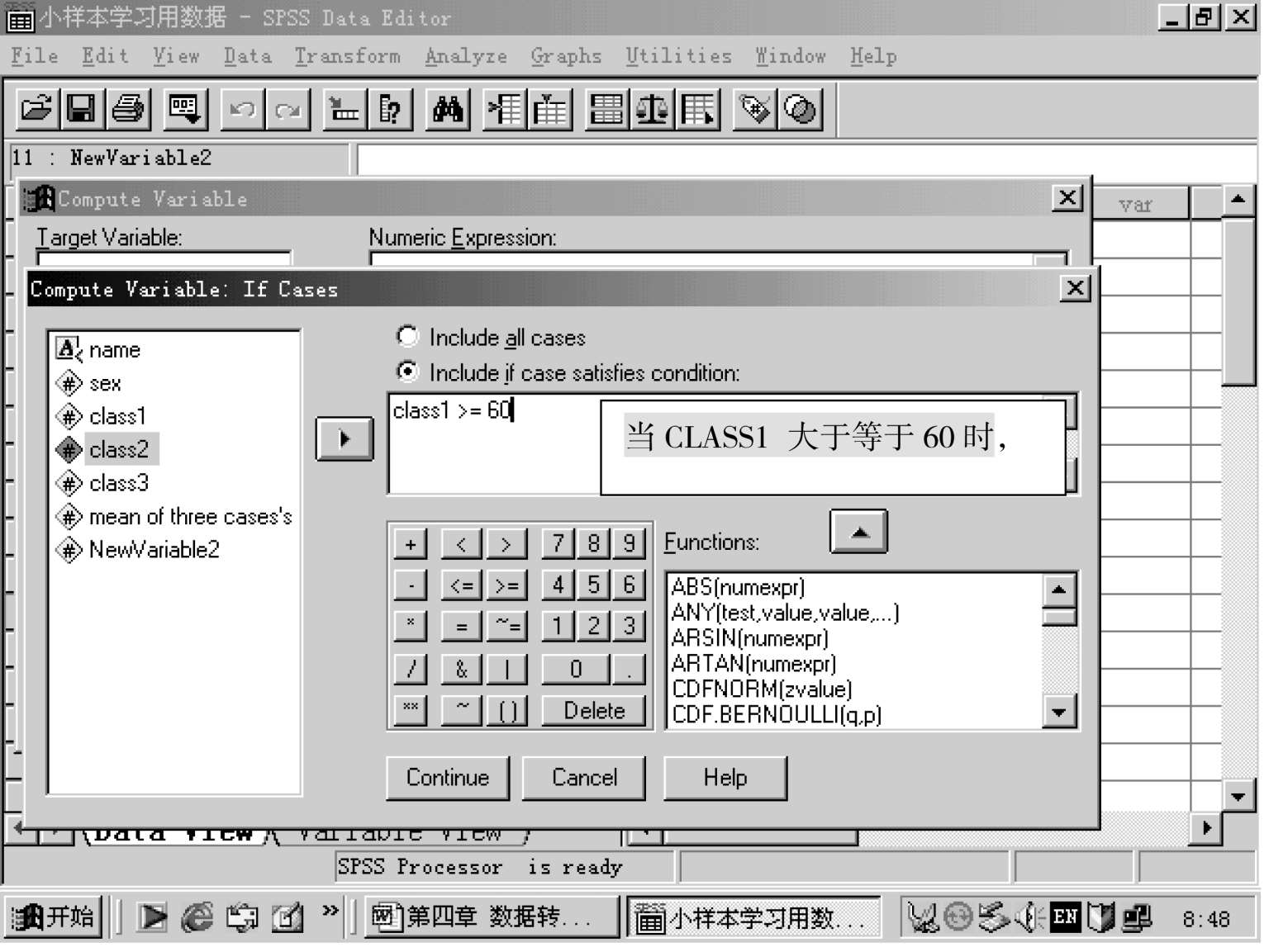 如果我们选择一个变量大于 60 分以上的数据,那么表达式为:变量= > 60 那么产生一个新变量,请看图示: