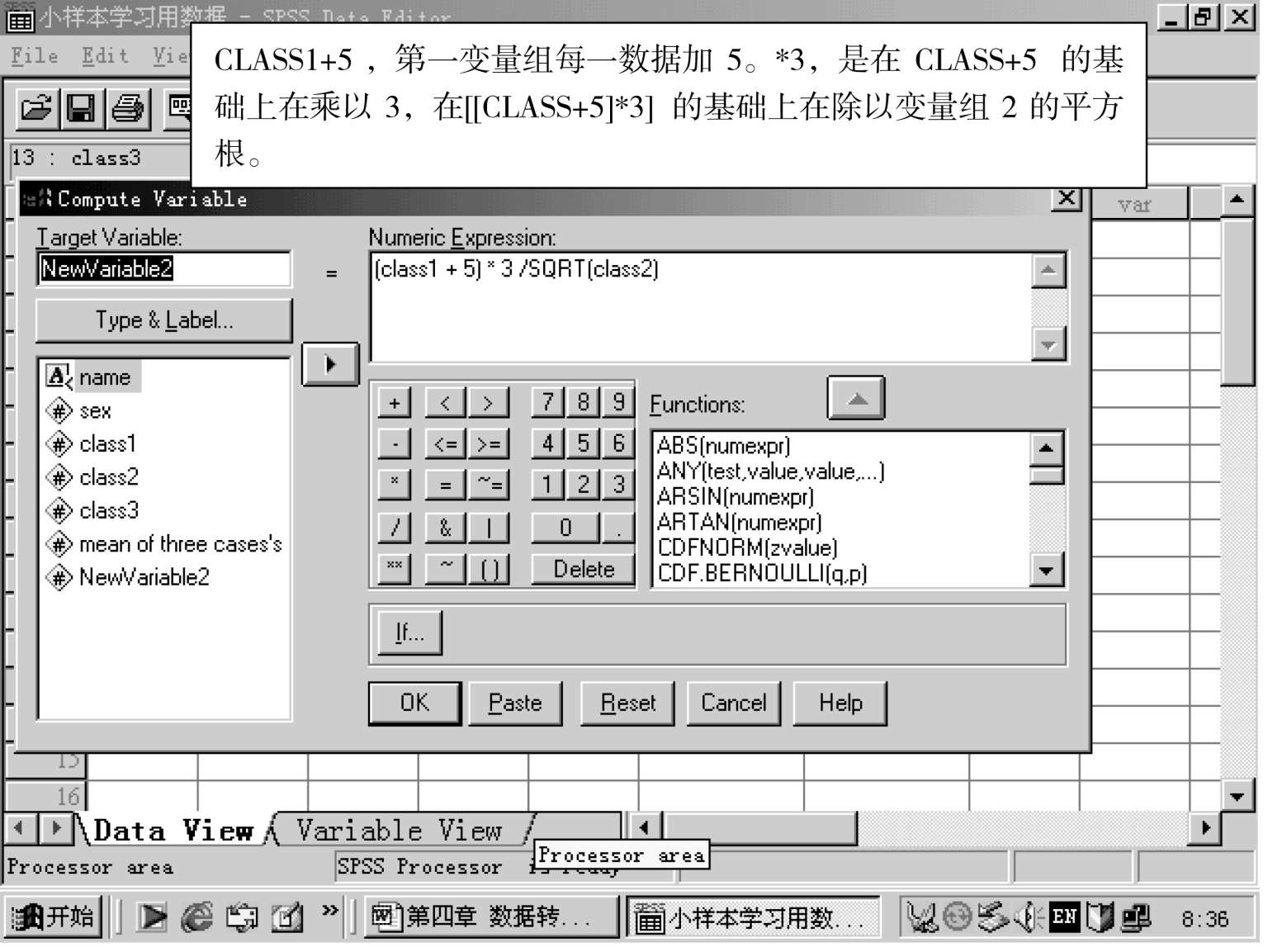 数据转换是对不适合做统计的数据的性质进行适当的改变,而后再使用统计过程。数据转换有 10 个功能,可分三组,第一组有运算(COMPUTE)、重新编码(RECODE)、可视化分段(VISUAL DANDER)、计数(COUNT)、记录排秩(RANK CASES)、自动编码(AUTO RECODE);第二组有创立时间序列(CREATE TIME SIRES)、替代缺失值(REPLACING MISS VALUE)、随机数种子(RANDOM NUMBER SEED);第三组只有一个功能,运行未完成转换(RUN PENDING TRANSFORM)。