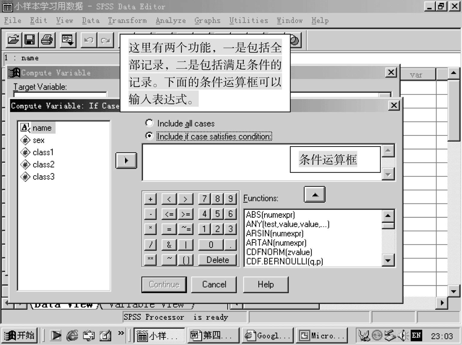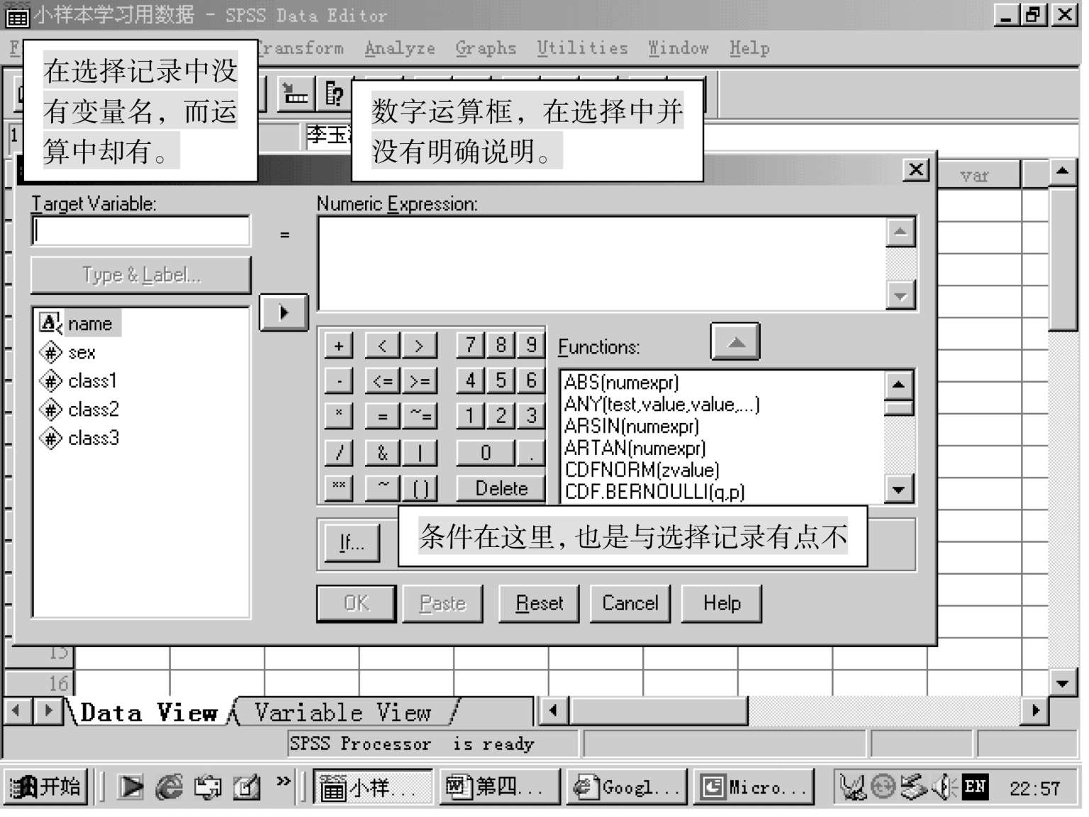 对于函数的应用,一要理解函数的意义,二要会用函数的表达式,三要尝试使用。掌握这两点,就能掌握函数在SPSS的使用。