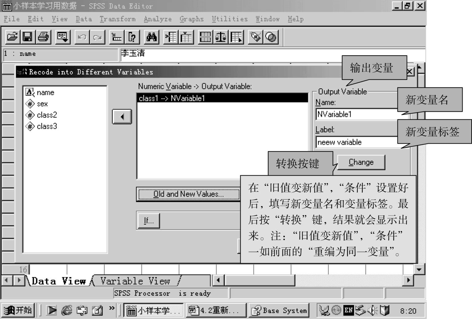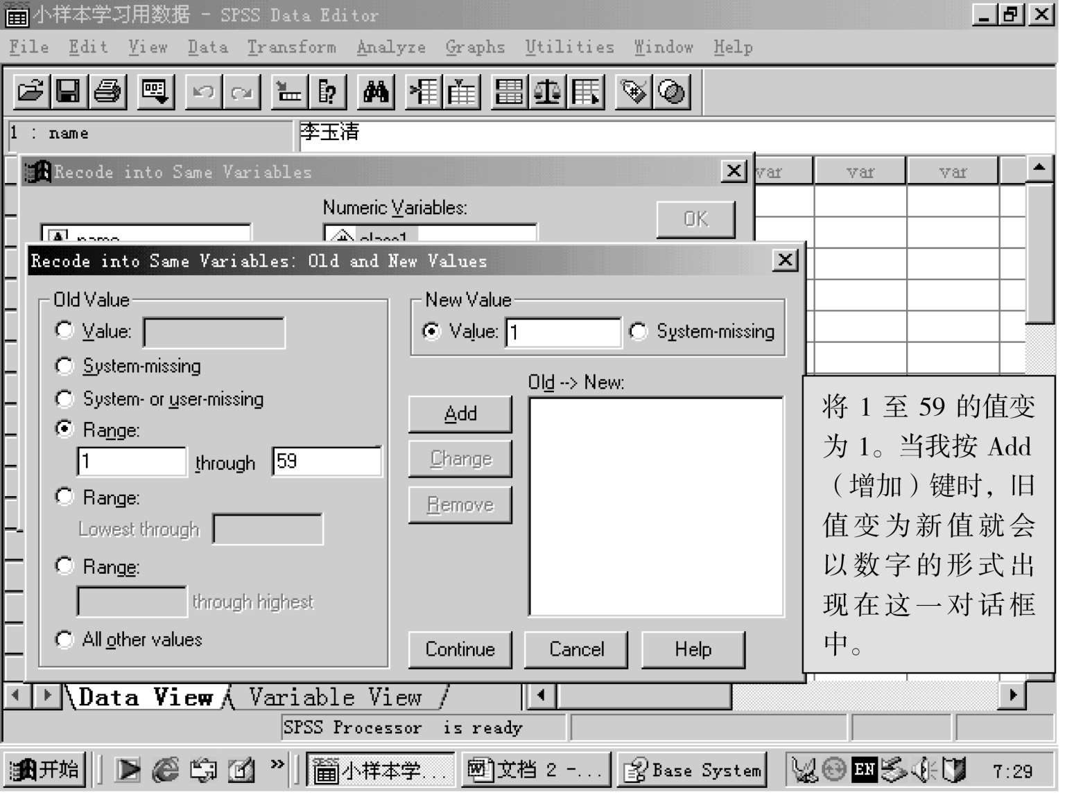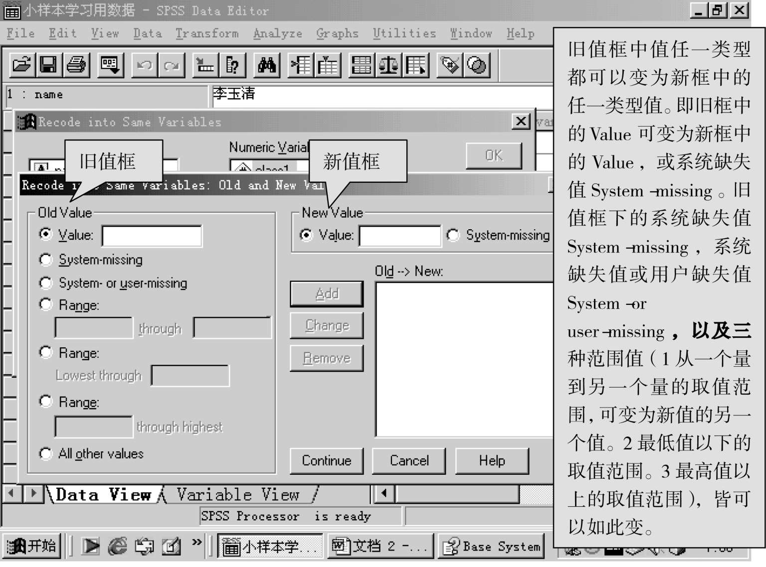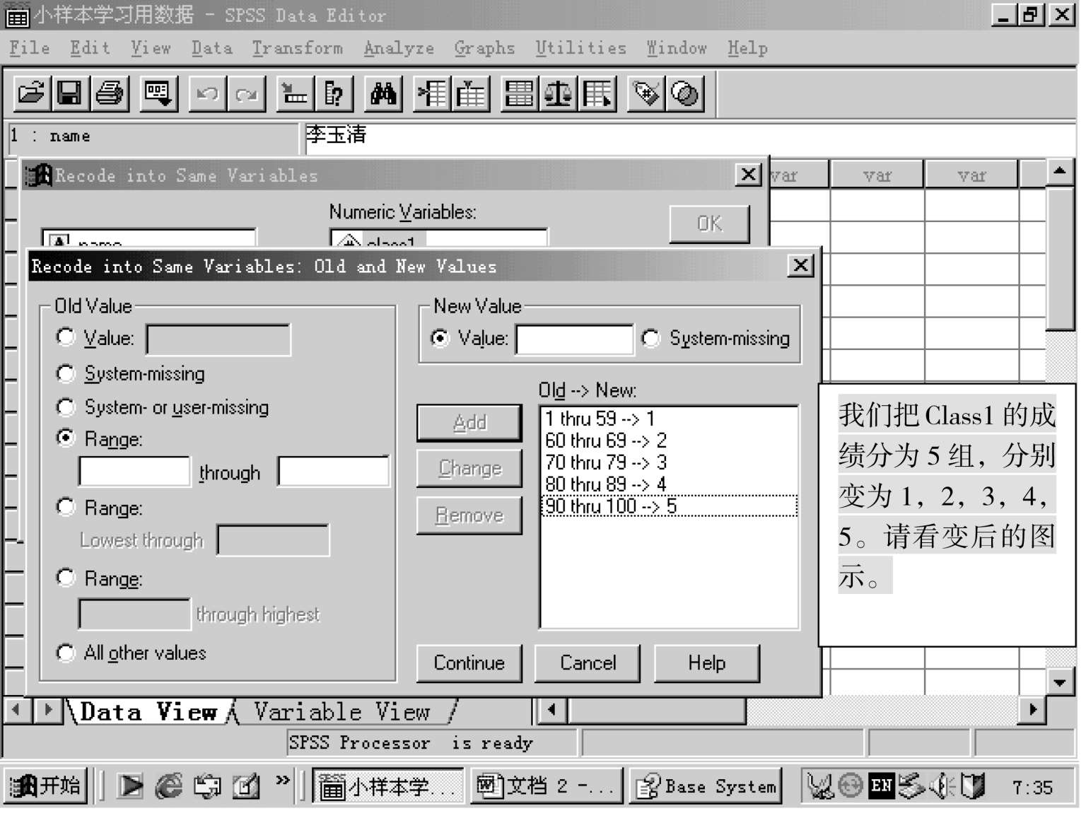 即将原变量的数据改变为另一类型的数据,即连续性变量可变为类别变量,或是另一种连续性的变量,这里的“重编为同一变量”,是说转换后的变量名不变,变的是变量名下面的数据。请看下图: