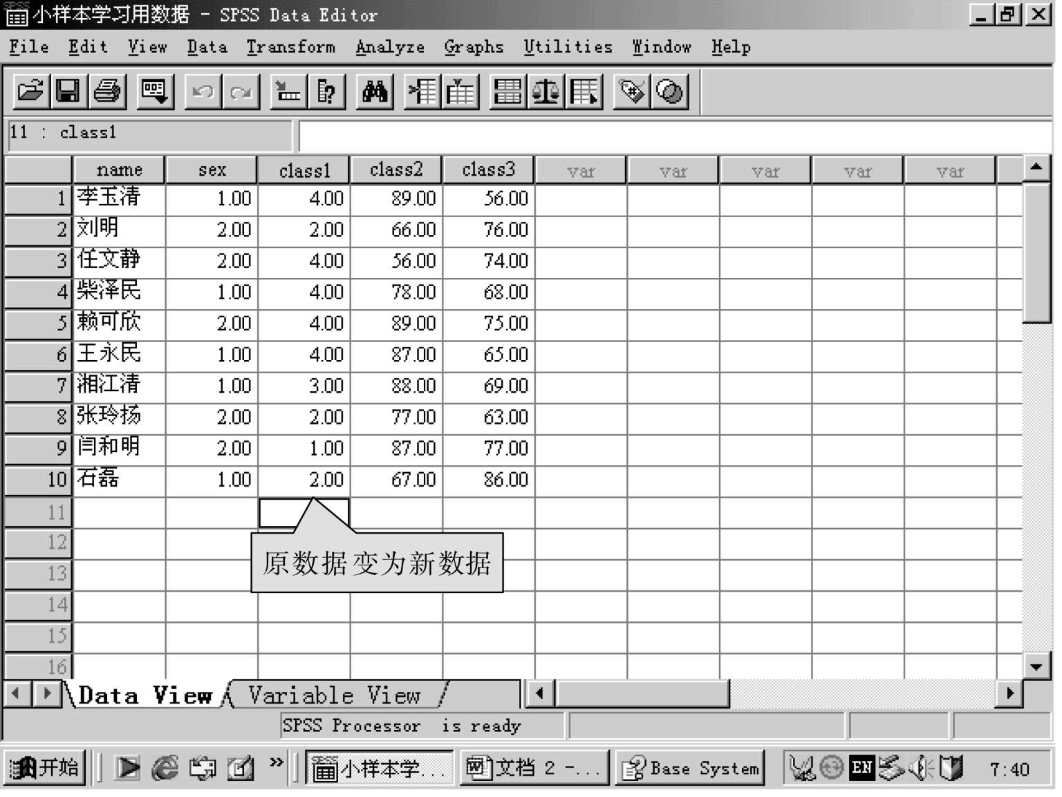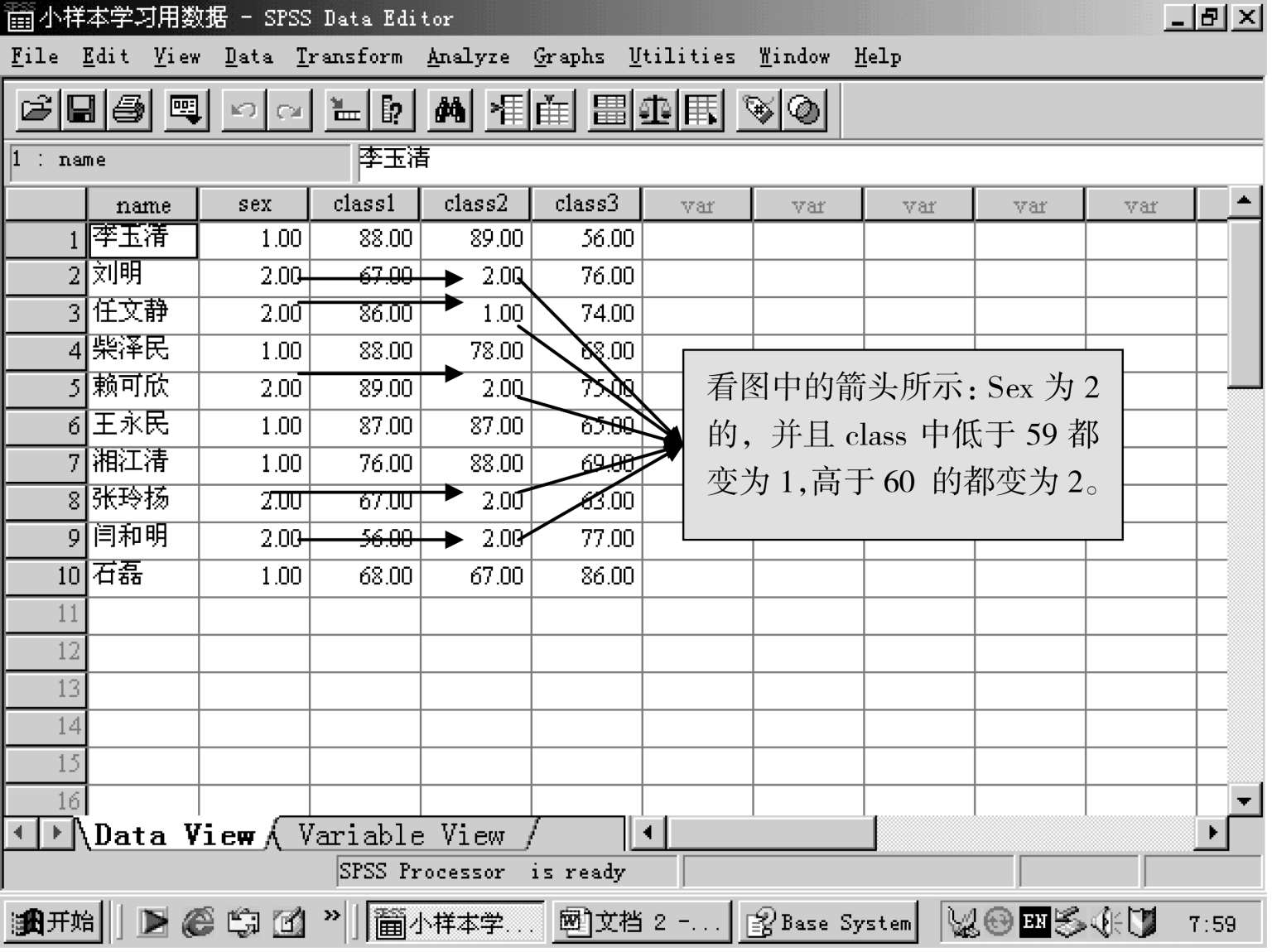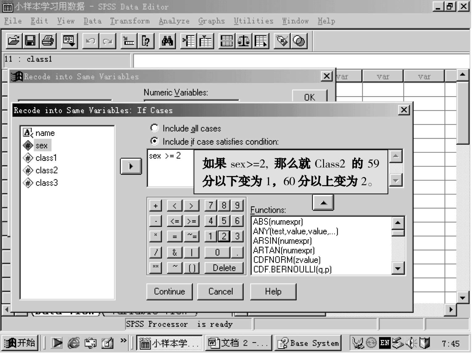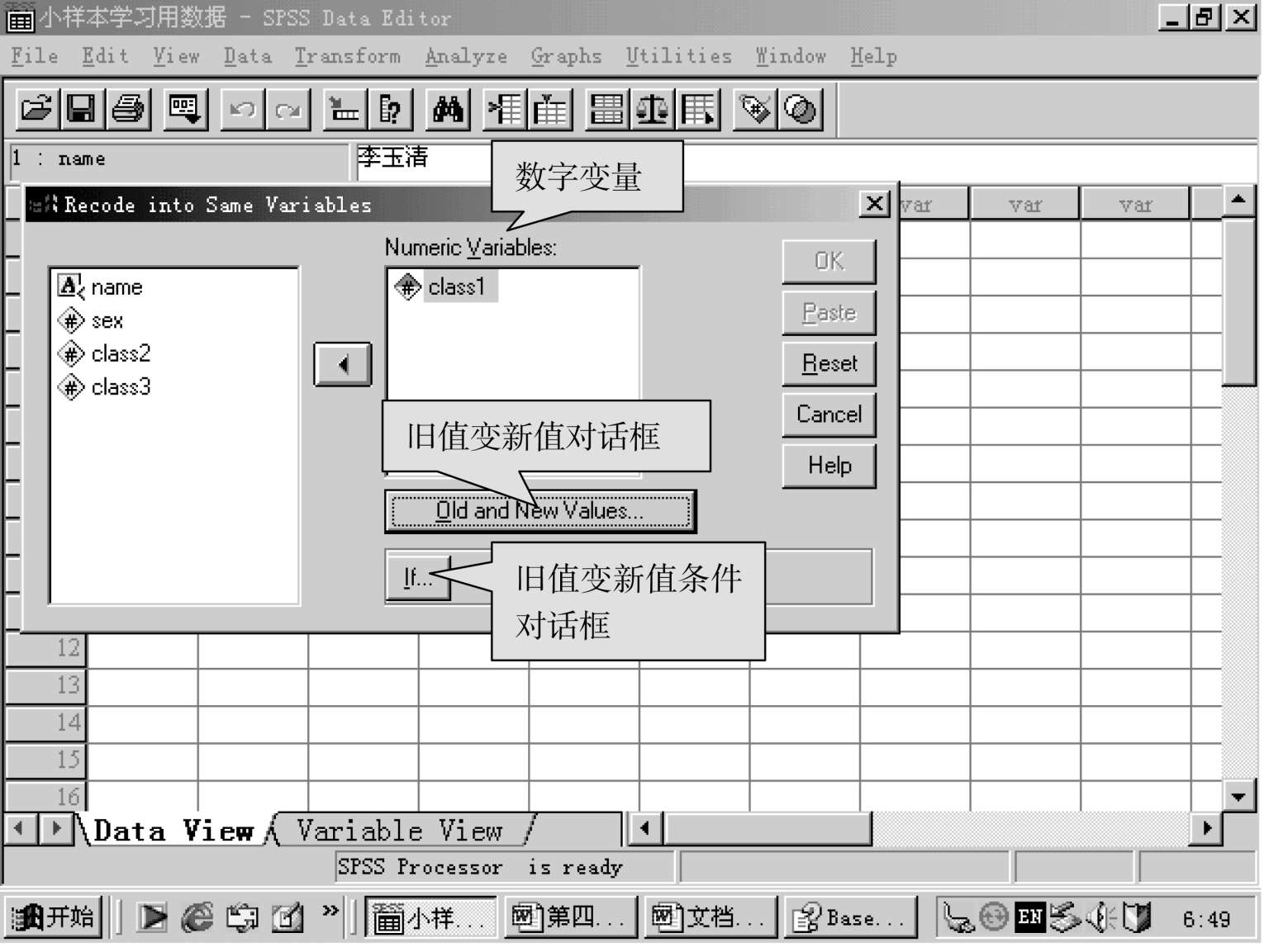即将原变量的数据改变为另一类型的数据,即连续性变量可变为类别变量,或是另一种连续性的变量,这里的“重编为同一变量”,是说转换后的变量名不变,变的是变量名下面的数据。请看下图: