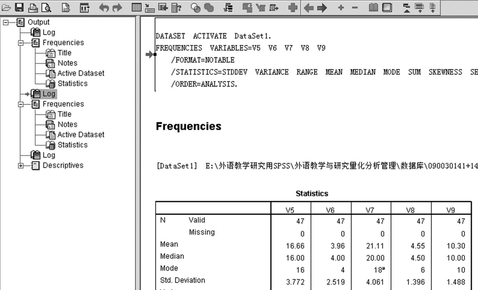 我这里只解释主要统计内容。有效记录均为 47,缺失值没有,V5V6V7V8V9的均值、中值、众数、标准差。