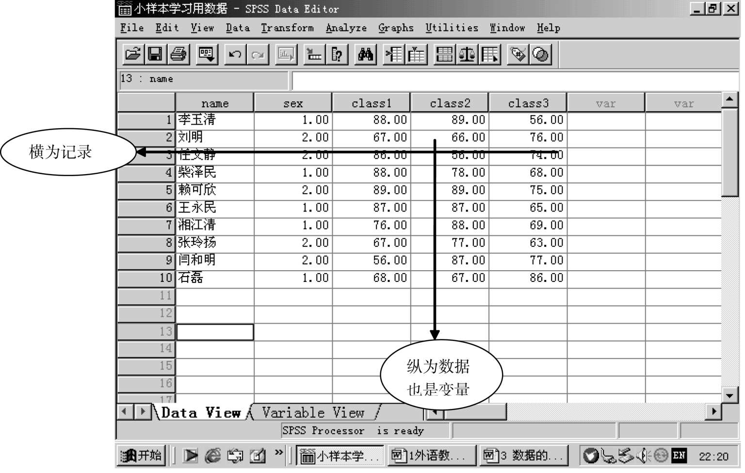 在数据窗中,数据横向是受试者的记录,纵向是各项的成绩或调查值,也是变量。