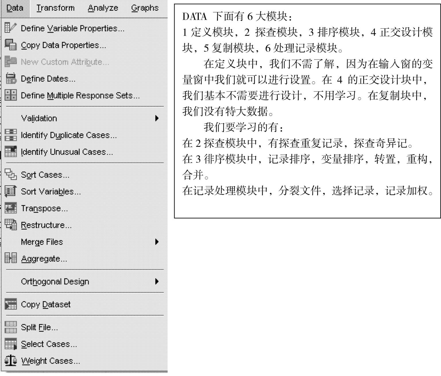 在SPSS中,数据的整理在输入窗的DATA一栏中,它提供的有,看下图: