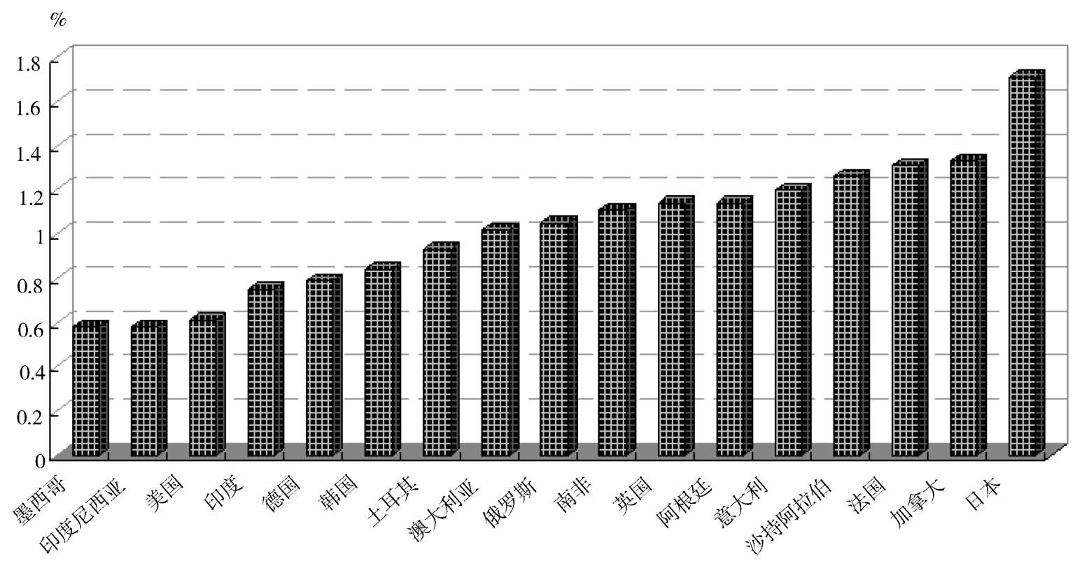 ,因此,税务机关的行政支出就大致接近于征税成本。国家税务总局公布了2010 年至2012 年我国国税系统的部门决算表,这为我们估算征税成本提供了非常有用的信息。假设国税与地税的人均预算支出相同(即人均征税成本相同),那么,全国征税总成本就等于国税系统人均支出与全国税务系统工作人数的乘积。从估算结果看(表 3-4):2010 ~2012 年间,我国征税成本率的均值为 2.48%,且有逐步下降趋势。该成本水平是高是低呢?考察G20 中其他国家的征税成本率,最低的墨西哥仅为0.58%,最高的日本也不过 1.71%,大多数在 1%上下(图 3-1)。由此可以推断,我国征税成本率是偏高的。