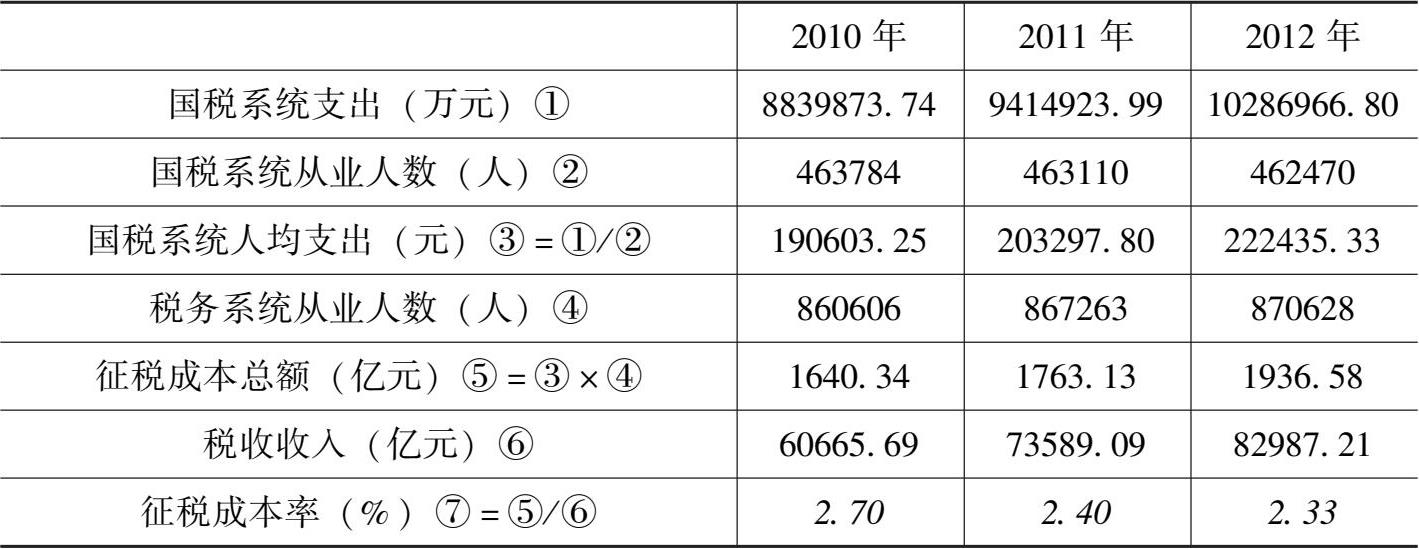 注:由于只计算税务机关的征税成本,因此在税收收入中剔除了由海关负责征收的关税、船舶吨税以及代征的进口环节增值税和消费税。