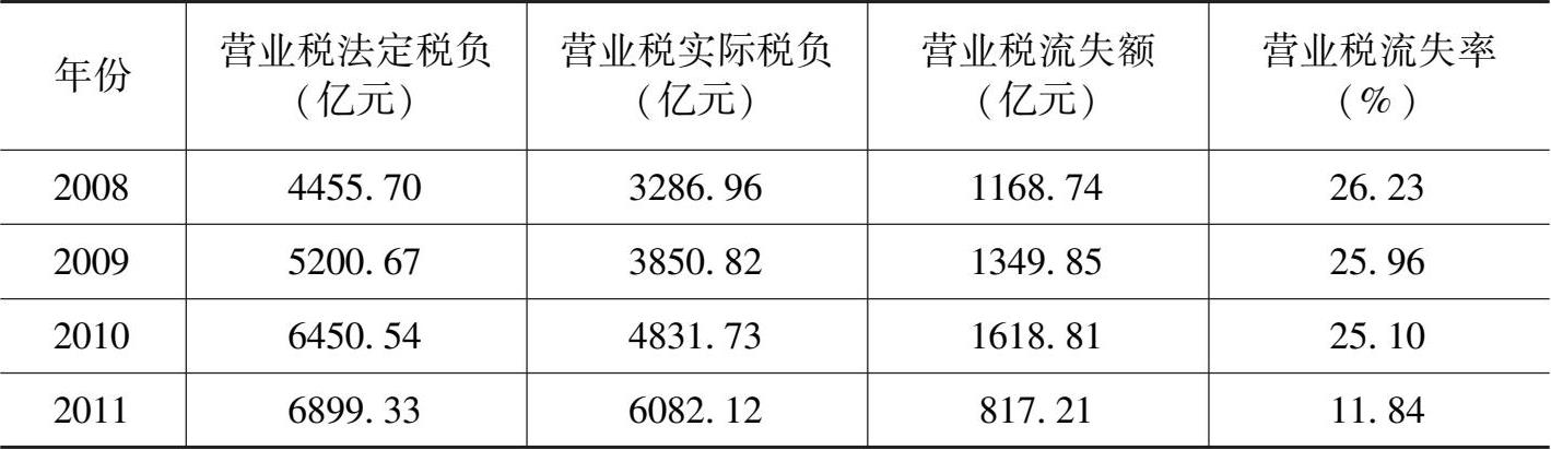 。由于通过公开资料只能获得部分行业的营业收入数据,所以只能在这些行业范围内测算营业税流失率,结果见表 3-2。