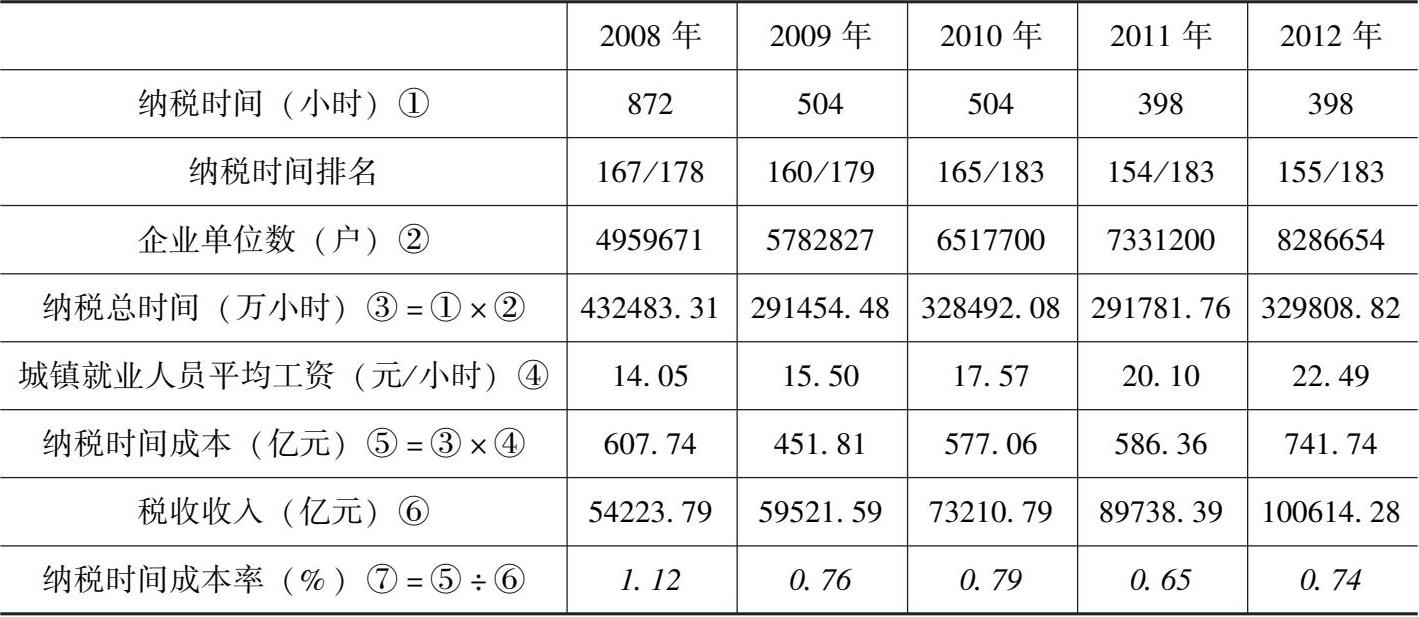 资料来源:(1)纳税时间及其排名来自历年世界银行与普华永道联合发布的《Paying Taxes: The global picture》;(2)企业单位数分别来自于《中国经济普查年鉴(2008 综合卷)》、《中国基本单位统计年鉴(2010)》、《中国统计年鉴》(2011 ~2013)》;(3)城镇就业人员(年)平均工资来自于历年《中国统计年鉴》,假设年工作时间为 52 周× 5 天/周× 8 小时/天= 2080 小时,则小时平均工资=年平均工资/2080;(4)税收收入来自于历年《中国统计年鉴》。