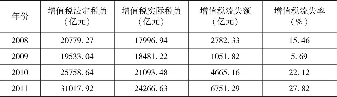 ,增值税法定税负原则上要根据不同税率对应的税基进行分解计算,但因缺乏相关数据,只能通过一个总体上的法定税率来处理。我们借鉴许文(2006)的做法,以规模以上工业企业应交增值税与工业增加值的比率作为平均法定税率。由此,计算得到近年来我国的增值税流失率(表 3-1)。