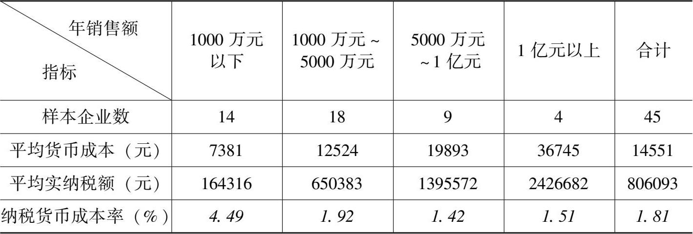 ,后者包括税务登记和年审费、购买发票费用、税控设备折旧及维护费、网上报税软件费、税收报刊资料订购费、办理涉税事项的交通费等。结果发现(表 3-5):平均纳税货币成本率为 1.81%,但不同规模企业的纳税货币成本率存在较大差异,总体上呈现出“累退性”特点