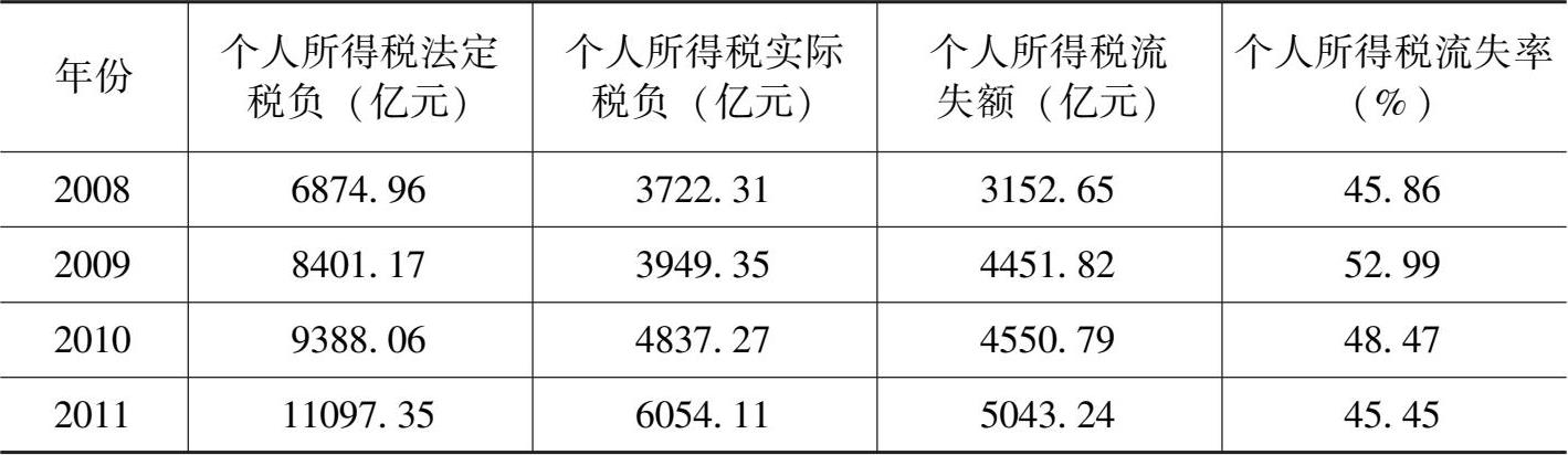 目前我国个人所得税实行分类征收,不同收入项目对应不同税率,个税收入能力理应按照税目分解测算,但该计算程序非常复杂。为此,咸春龙(2012)运用一个适度简化了的收入能力估测模型对我国个人所得税流失率进行了测算。本书按照他的方法,补充计算了 2010 年和 2011 年的数值