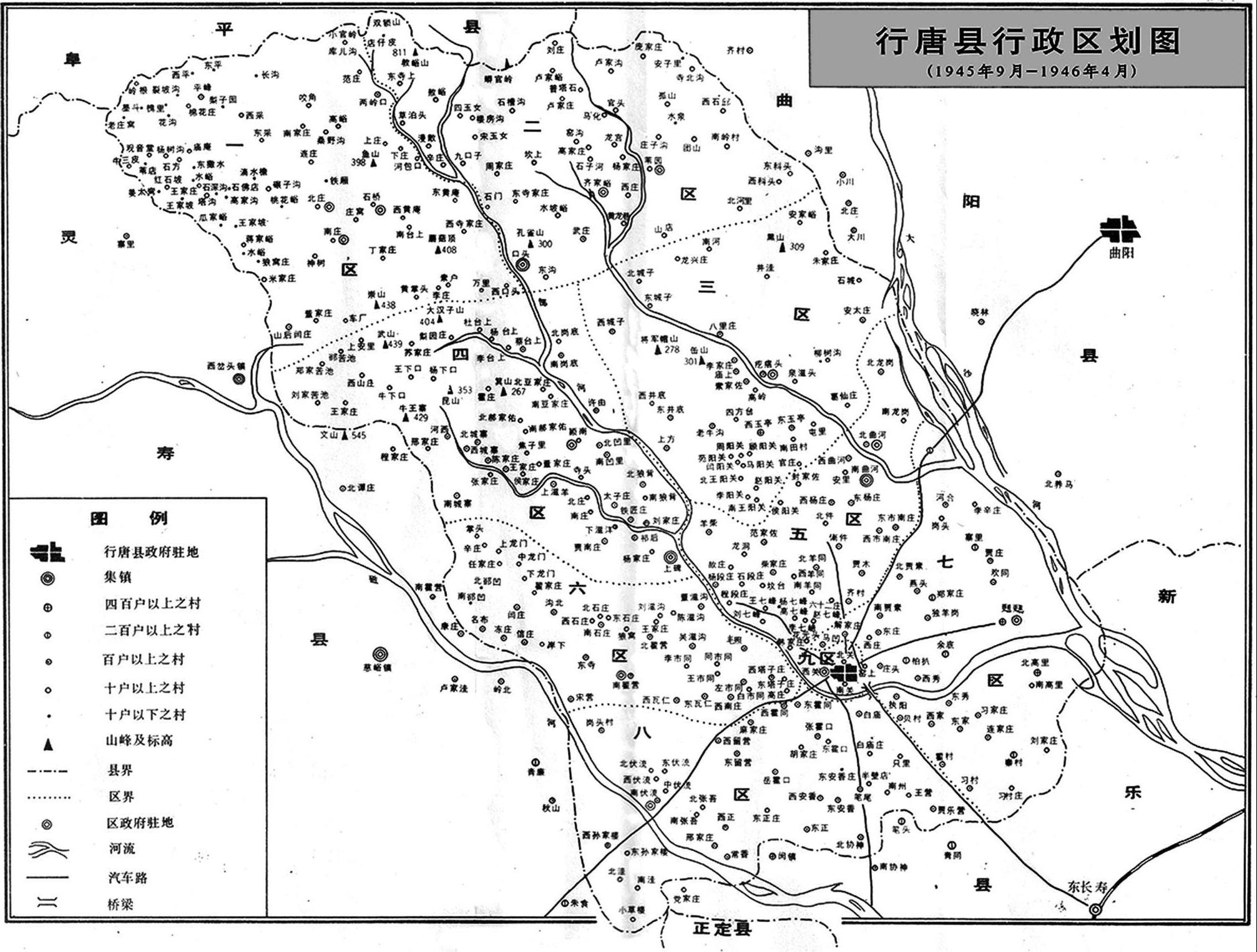 由县委党史研究室绘制的 1945 年行唐行政区划图,体现了特定时期行唐的 8 个区布局,显示了解放后设立的第九区,对于我们认识行唐抗战历史有很好的帮助。