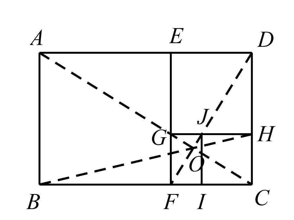 (2)作正方形 ABFE ,则矩形 EFCD 仍为黄金矩形;再作正方形 EDHG ,则矩形 FCHG 也为黄金矩形,如此下去,可得一串正方形与一串黄金矩形(这反映了它的再生性);