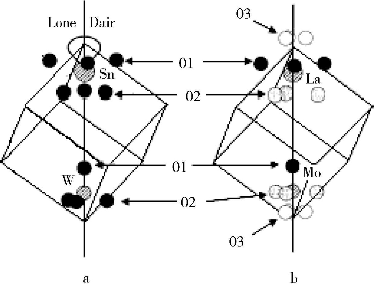 La 2 Mo 2 O 9 可以看成是三价的La 3+ 替代了β-SnWO 4 的二价Sn 2+ ,Mo 6+ 替代了W 6+ 。La 2 Mo 2 O 9 的三价La 3+ 没有孤对电子,而β-SnWO 4 的二价Sn 2+ 有一对5S 2 电子,SnWO 4 可以写成Sn 2 W 2 O 8 E 2 (符号“E”来表示孤对电子),替代之后,Sn 2 W 2 O 8 E 2 的两个孤对电子E的位置其中一个恰好被La 2 Mo 2 O 9 中相比SnWO 4 多出来的那个氧离子占据,并用来满足电中性原则,同时,另一个孤对电子E的位置就产生了一个氧空位。