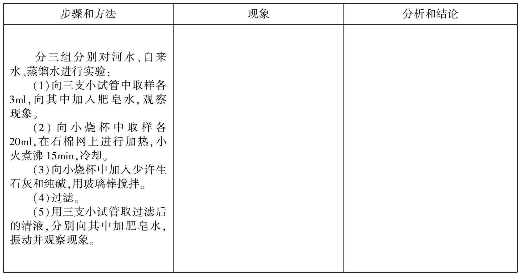 1.每组用品:小试管(2 支)、小烧杯(2 个),漏斗、玻璃棒、石棉网、铁架台、酒精灯;河水、自来水、蒸馏水、肥皂水、生石灰、纯碱。