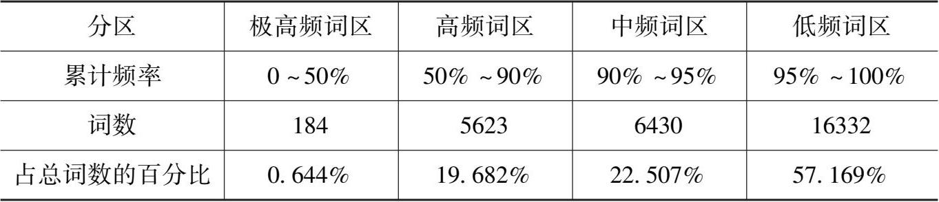 上表的统计数据表明,《歧路灯》中词语出现频次在 100 次以上的前 452个词,词汇使用的累计覆盖率达到了 62.09%,而出现频次在 10 次以上的词汇有 3027 个,词汇使用的累计覆盖率已经达到了 84.51%。另外,根据该文的统计,《歧路灯》中不计重复的用词总数为 28569 个,作者根据这些词语的累计频率,将其分为极高频词区、高频词区、中频词区和低频词区四个区段,具体分布情况如下表所示。