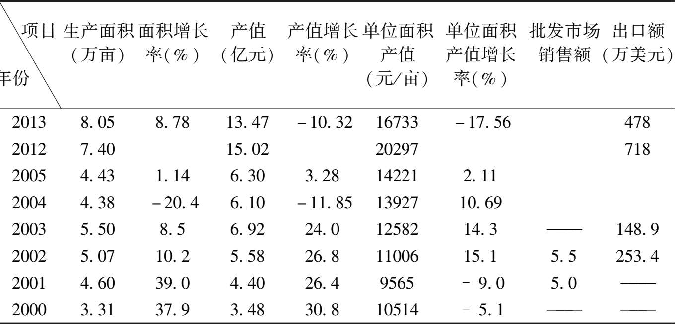 从调查和相关资料来看,由于市场需求量大,销售稳定,各花卉生产企业、销售企业和绿化工程单位的花卉业收益状况较好。以生产为例,截至 2012 年底,全市花卉生产总面积 4933.3 公顷,年产值 15 亿元,每亩土地平均年收益近两万元左右。