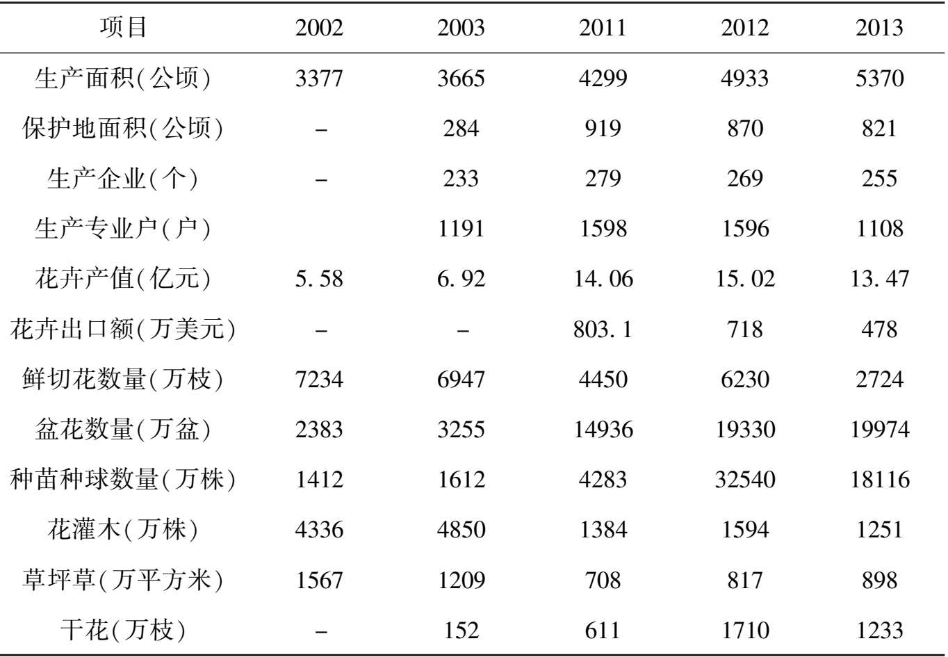 2013 年底花卉生产面积达到 5369.56 公顷,年产切花 3995 万枝,盆花20473 万盆,种苗 17887 万株、种球 229 万头,花灌木 4336 万株,草坪草 683 万平方米,年产值 7883 万元。