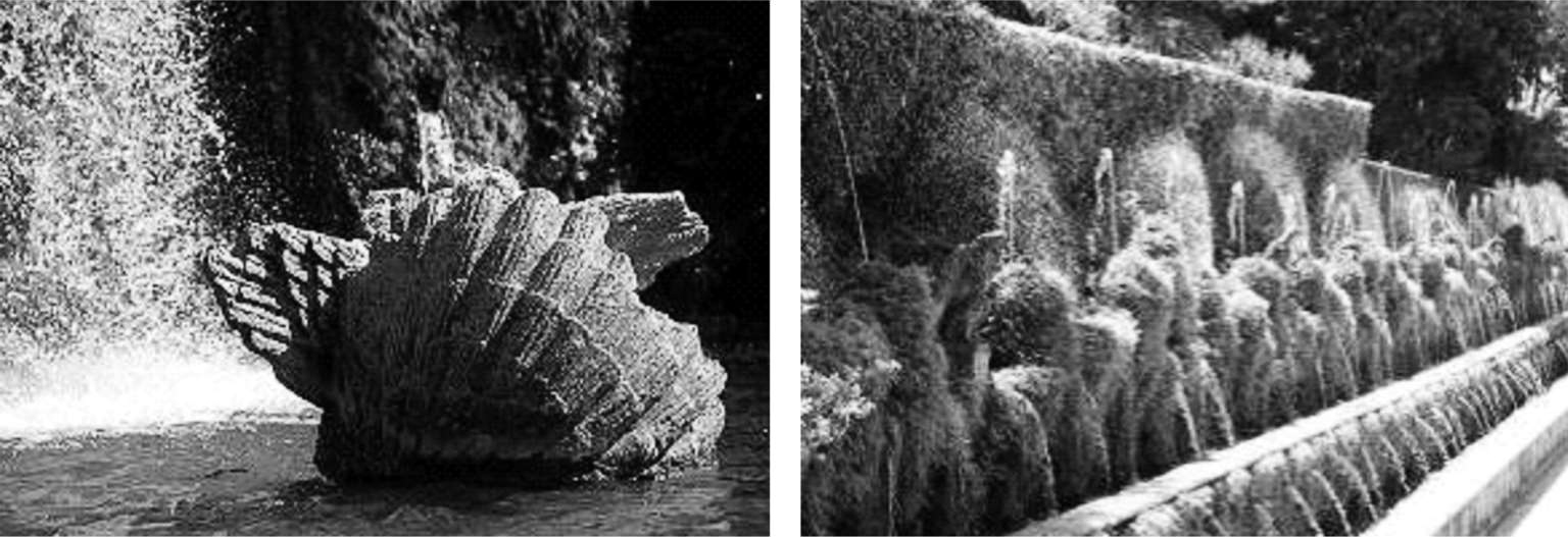 同时,这种动态的关系还表现在对自然过程的隐喻和喷泉的精巧设置等方面。与法国古典主义园林中的静态水景不同,文艺复兴园林中的水景是动态的。奔流的水景给风景园林带来了动感、光影的明灭闪烁和清泠的声响,如同风景园林的血脉,生机勃勃,彰显了生命的活力;同时也隐喻了水在自然界中的各种形态,从出自岩隙的清泉到湍急的溪流,到飞泻的瀑布,甚至是象征江河和湖海的渠道及水池,还有活泼生动、处处喷涌的喷泉水嬉,这些都不仅仅是作为人类活动的背景,或是为实现人的享乐而服务的仆从,这些巧妙的设计更多地体现了人们的审美理想和生活方式。