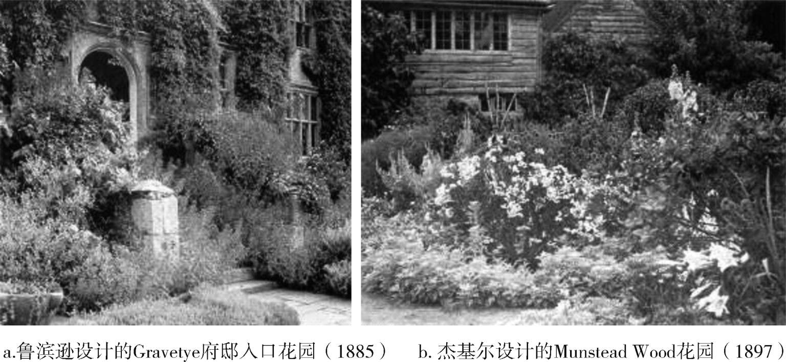 19世纪下半叶(1859~1910),艺术评论家约翰·拉斯金(John Ruskin)和诗人威廉·莫里斯(William Morris)倡导的工艺美术运动(Arts And Crafts Movement)反对机械产品的粗制滥造和装饰的矫揉造作,留恋中世纪“师法自然”的风格和特征,主张设计从大自然中汲取创作的灵感,并以纯净的设计风格呈现出对清新自然的追求和崇拜,同时也强调设计的社会性、实用性与艺术性的结合。工艺美术运动是对工业革命的反思,其暗含的社会主义思想扩展了朴素生态观念的内涵,从关注自然环境扩展到关注社会公平、居住环境及公民的生活与精神需求等层面。受其思想的影响,风景园林的风格开始出现更加单纯、更加浪漫的形式,对城市公园的兴起及小庭院的景观设计具有积极地影响,代表人物包括才华横溢的植物学家鲁滨逊(William Robinson)、园艺家杰基尔(Gertrude Jekyll)以及建筑师路特恩斯(Edwin Lutyens)。作为植物学家的鲁滨逊强调运用自然材料来烘托小尺度花园的简洁、浪漫和高雅的氛围,并且认为风景园林设计应该注重植物的生态习性,提倡多应用多年生植物,反对应用一年生的草本花卉。因此,鲁滨逊厌恶人工气息浓重的几何种植方式,偏爱多年生植物的搭配与混种,以形成完全自然式的园林风格。虽然,鲁滨逊应用的花卉种类繁多、色彩艳丽,却最终呈现出一种灰色调的纯净美感,丝毫不显夸张(图4-1a)。园艺学家杰基尔与建筑师路特恩斯借鉴了鲁滨逊的设计风格与形式,提倡从大自然中获取设计的源泉,使风景园林充满了乡间的浪漫情调。他们的设计使规则式布置与自然植物的完美结合,路特恩斯负责设计规则的硬质部分,而杰基尔则运用色彩斑斓的植物柔化规则的线条。基于对植物生理、生态特性的了解,杰基尔设计的植物群落形式多样、线条柔和、边缘模糊,不同色彩和质地的植物彼此之间能够形成鲜明的对比(图4-1b)。这种以规则式布局为骨架,以自然植物为血肉的设计风格经杰基尔与路特恩斯的推广得到了普及,至今仍有一定的影响。