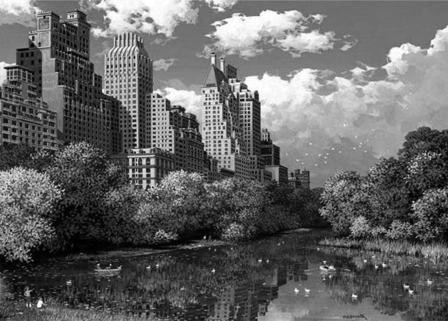 Fig.4-5 Stark contrasts between urban landscape and park landscape in the Central Park(图片来源:Central Park Fallpainted by Alexander Chen http://www.hsart.com)