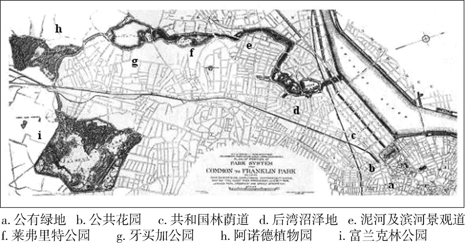 的大波士顿区域内,建立了由海岸、港湾岛屿、潮汐河口、森林保护区及公共游乐场共同构成的公园系统,并且获得了法律的认可。1891年,埃利奥特提出通过建立滨河景观带等自然廊道的方法将大波士顿地区(包括波士顿市区和周边的剑桥、布鲁克莱恩等区域)边界的 5 个大型公园和绿地空间连接为整体的建议,史称大波士顿地区公园体系(Boston Metropolitan Park System)。