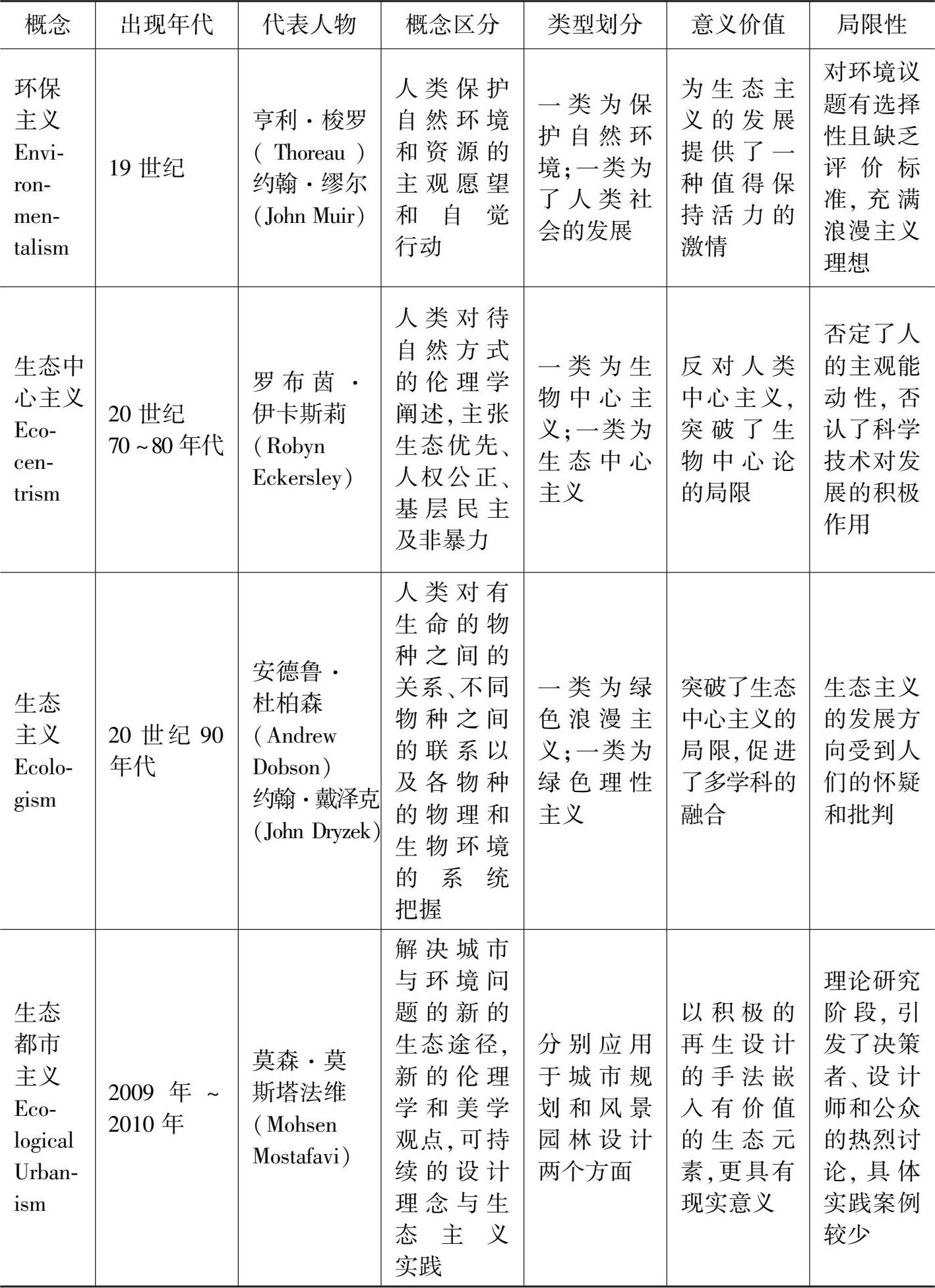 本书的研究对象“生态主义(Ecologism,Ecological Ideology)”是一个广义的概念,是以整体主义为核心的道德理论,是在环保主义、生态中心主义、浅深生态主义等思想流派的基础上发展而来,是对环保主义非理性的浪漫主义理想的超越、对人类中心主义的否定、对生物中心主义的拓展和对浅层、深层生态学等基础理论的局限性的突破和有效补充。广义上的生态主义包括两大范式,分别是以人类中心主义为核心的生态主义和以生态中心主义为核心的生态主义。同时,生态主义思想又被划分为绿色浪漫主义和绿色理性主义两种类型;而本书研究的重点为绿色理性的生态主义,其以科学为导向的特征为人类社会重新确立了新的科学观、技术观、自然观和世界观。广义的生态主义的内涵与外延涉及人与自然的和谐状态、人与人的平等关系、绿色经济与节约生活以及生态危机的归因。生态主义思想的意义与价值主要体现在意识形态、哲学价值、人类发展、社会文化、科学研究、城市建设与环境保护等方面,生态都市主义思潮是生态主义思想在城市规划与风景园林设计领域中发展至成熟阶段的具体表达,同时其涌现也是推动生态主义思想在西方近现代风景园林领域发展演化的主导因子之一(图2-2)。生态主义的相关概念之间既有联系又有区别,主要表现为各个概念出现的时期、主要代表人物、具体概念的描述、划分的具体类型、具有的意义与价值及所存在的局限性等多个方面。作为前文概念研究的归纳和总结,现将相关概念之间的具体区别与联系详列如下(表2-1)。