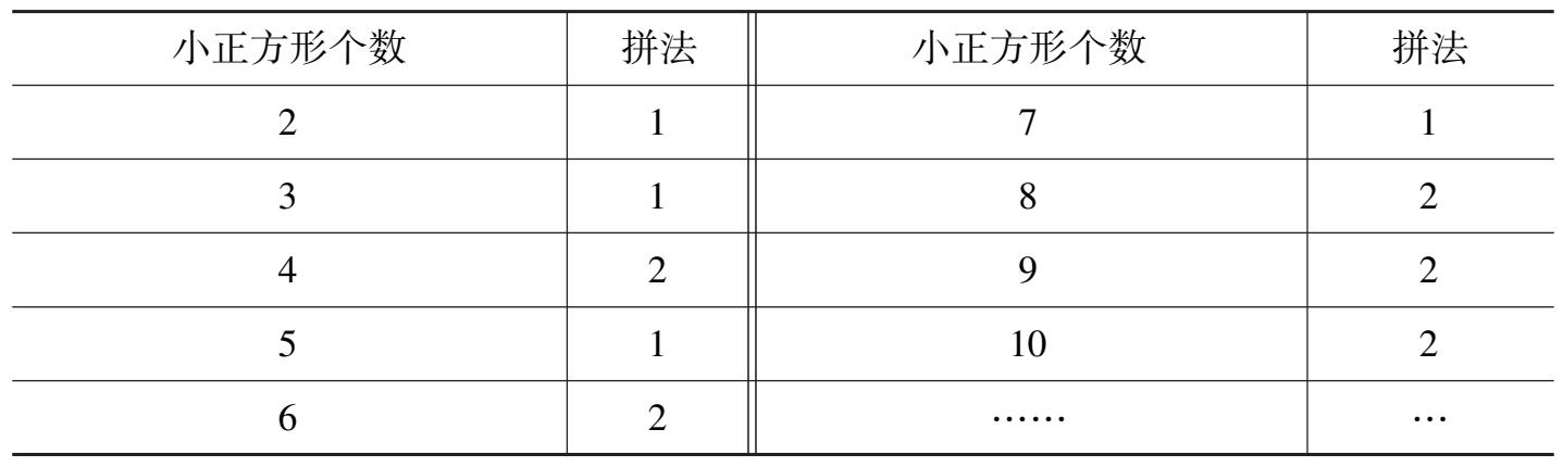 2.用 4 个小正方形拼成长方形的个数比用 2 个、3 个小正方形的拼法要多。是不是小正方形的个数越多,拼法也越多?拼一拼,看看这样的猜想是否正确。