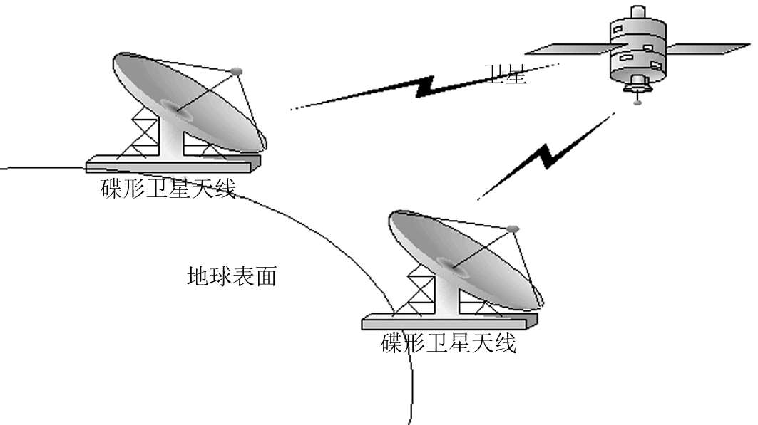 图2-6是一个简单的卫星通信系统示意图,表示通过卫星微波形成的点对点通信线路,它是由两个地球站(发送站、接收站)与一颗通信卫星组成的。卫星上可以有多个转发器,它的作用是接收、放大与发送信息。目前,一般是12个转发器拥有一个36MHz带宽的信道,不同的转发器使用不同的频率。地面发送站使用上行链路(uplink)向通信卫星发射微波信号。卫星起到一个中继器的作用,它接收通过上行链路发送来的微波信号,经过放大后再使用下行链路(downlink)发送回地面接收站。由于上行链路与下行链路使用的频率不同,因此可以将发送信号与接收信号区分出来。