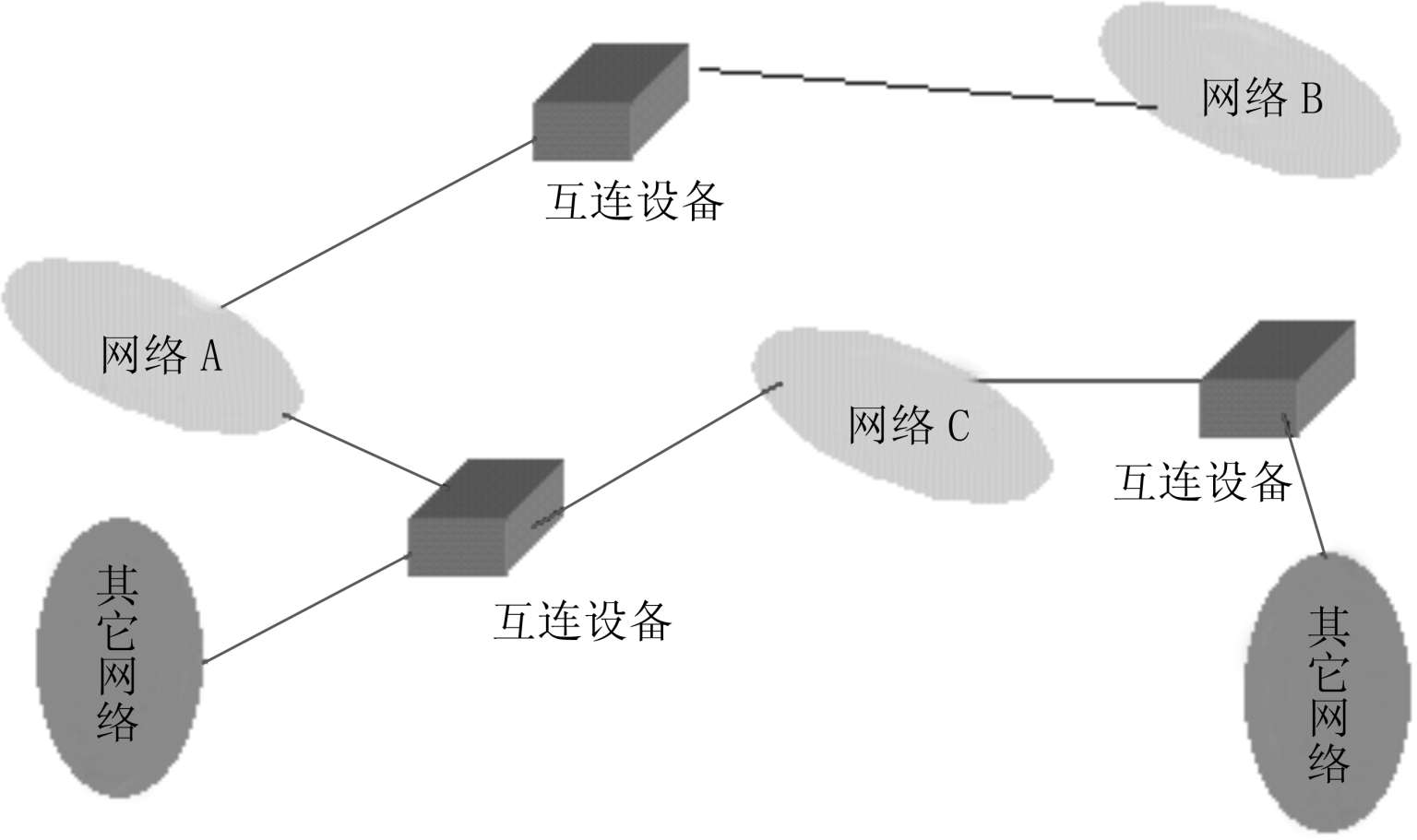 在Internet中,有两种层次的网络连接:一种是互联(internetworking),指网络间物理与逻辑尤其是逻辑上的连接;另一种是互连(interconnection),指网络间物理上的连接。如图2-7所示。