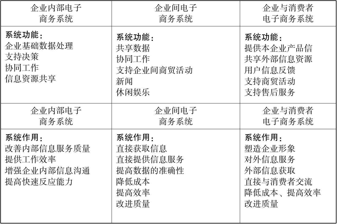 从商务角度看,电子商务系统由企业内、企业间以及企业与消费者之间三者组成。其功能和作用如表3-1所示。