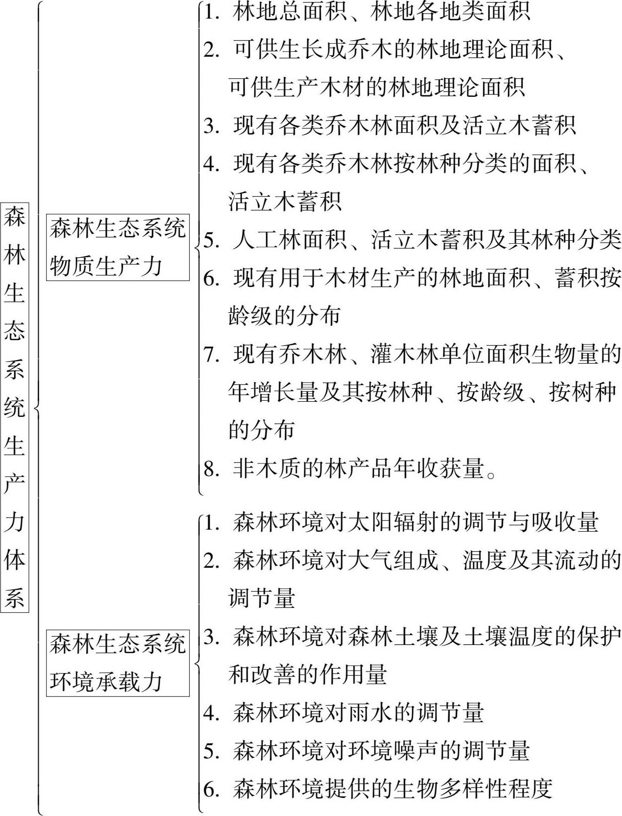 森林生态系统物质生产力体系主要包括:第一,林地总面积、林地各地类面积;第二,可供生长成乔木的林地理论面积、可供生产木材的林地理论面积;第三,现有各类乔木林面积及活立木蓄积;第四,现有各类乔木林按林种分类的面积、活立木蓄积;第五,人工林面积、活立木蓄积及其林种分类;第六,现有用于木材生产的林地面积、蓄积按龄级的分布;第七,现有乔木林、灌木林单位面积生物量的年增长量及其按林种、按龄级、按树种的分布;第八,非木质的林产品年收获量。森林生态系统环境承载力体系主要包括:第一,森林环境对太阳辐射的调节与吸收量,如太阳辐射吸收量、太阳光质变化量;第二,森林环境对大气组成、温度及其流动的调节量,如减缓风速程度、消除大气污染程度、光合与呼吸作用程度、降温作用;第三,森林环境对森林土壤及土壤温度的保护和改善的作用量,如减少地表水土流失量(或河川流沙量)、净化土壤最大污染量(或河川有机质含量)、防治地质的崩塌量、土壤结构的改良程度和动态;第四,森林环境对雨水的调节量,如削减和延缓洪峰量、年河川径流波动调节量和补枯量;第五,森林环境对环境噪声的调节量。第六,森林环境提供的生物多样性程度,如物种多样性程度、种群数量大小等。目前,我国对森林生产力体系的研究还处于初始阶段,许多都是定性的研究,定量的研究很少。当然对于其定量的研究,也正是我们以后发展和努力的方向。