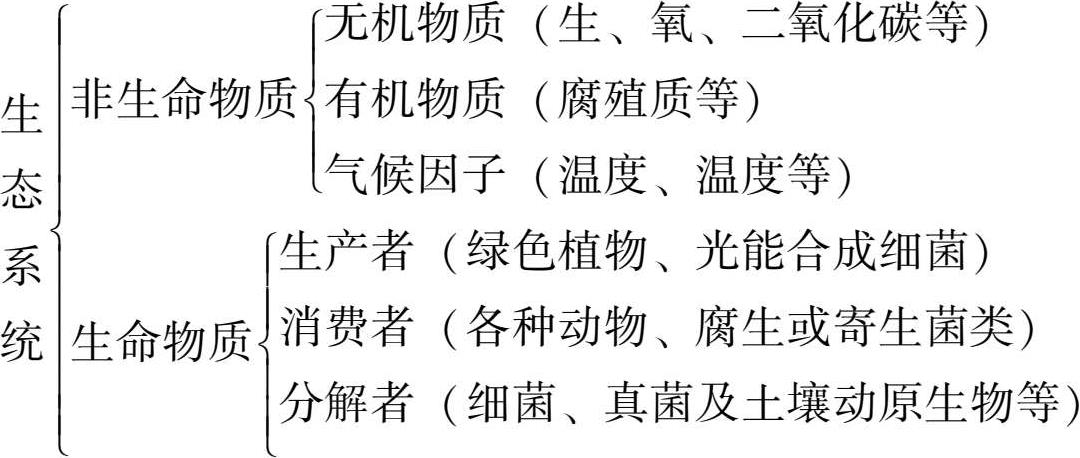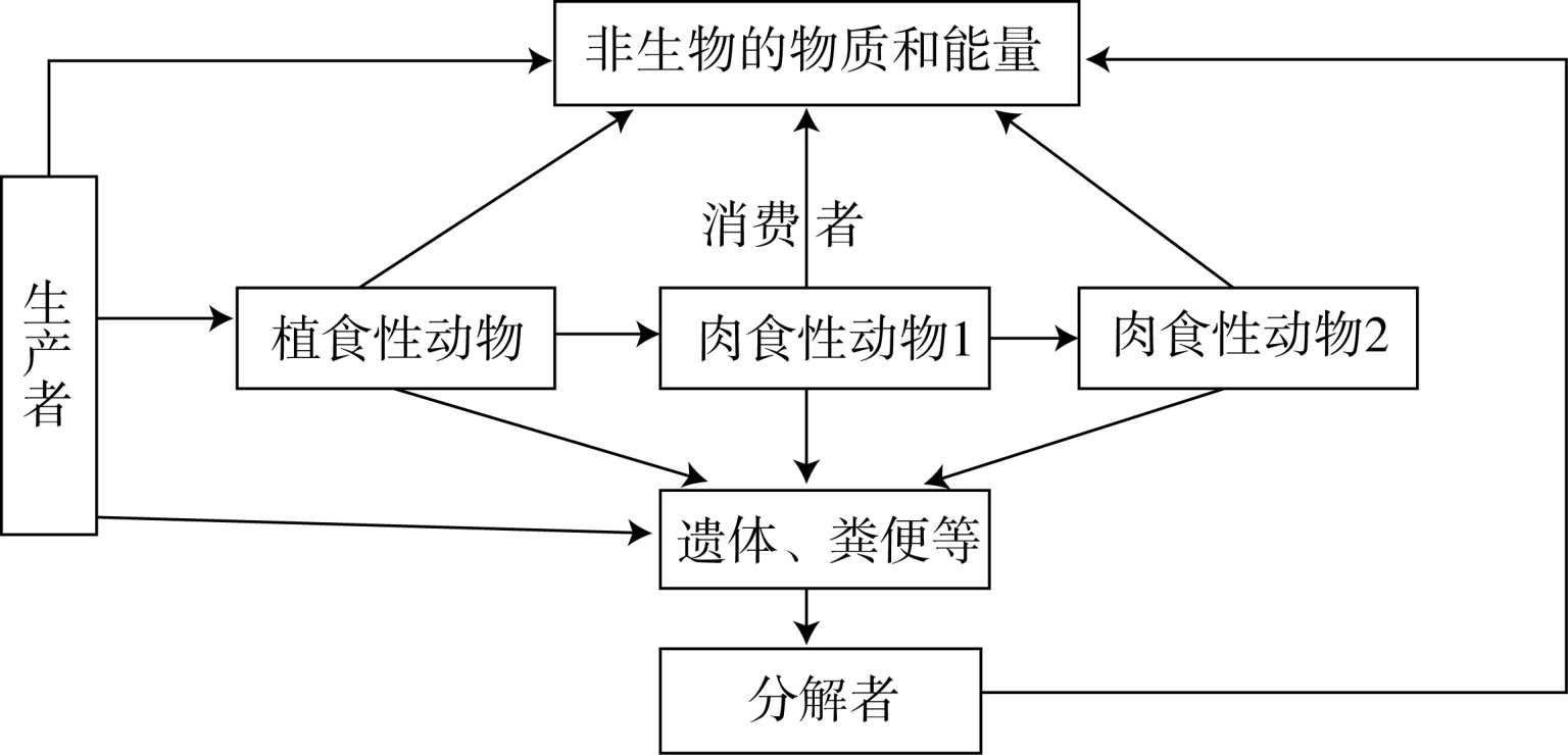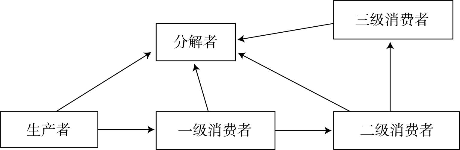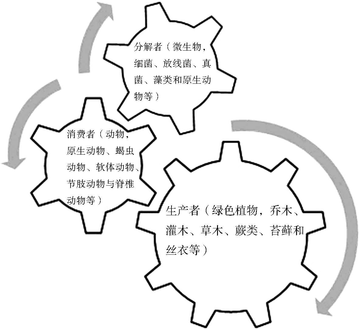 生态系统中,非生命物质构成动植物赖以生存的环境条件。生产者是生态系统中最积极的因素,它们利用太阳能并从周围环境中摄取无机物合成有机物,以供自身和其他生物营养需要。消费者只能依赖生产者生产有机物为营养来获取能量。依物质不灭定律,这些消费者死亡后,由分解者分解成简单的无机物,还给大自然,又供生产者(绿色植物)再次利用。所以生态系统中,这些有机物、无机物、有生命物质、无生命物质不断循环,相互转化,形成生态平衡(如图 2-5 所示)。