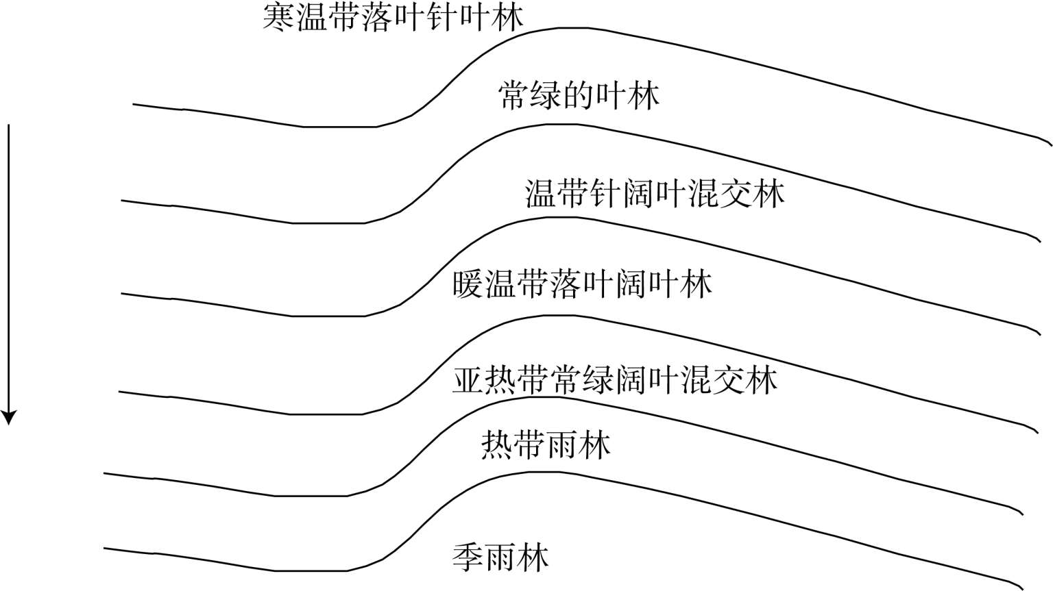 我国位于欧亚大陆东部,北抵寒温带大陆,南至热带海洋,地域差异明显。生物区系跨越两大界,即动物地理学上的古北界和东洋界,植物地理学上的泛北界和古亚热带界,因而孕育了丰富多彩并且独具特色的生物种群和生态系统。我国的森林类型十分复杂,地跨不同的气候带。由北向南的地带性森林类型有寒温带落叶针叶林、常绿针叶林、温带针阔叶混交林、暖温带落叶阔叶林、亚热带常绿阔叶混交林、热带雨林和季雨林等类型(如图2-14 所示)。