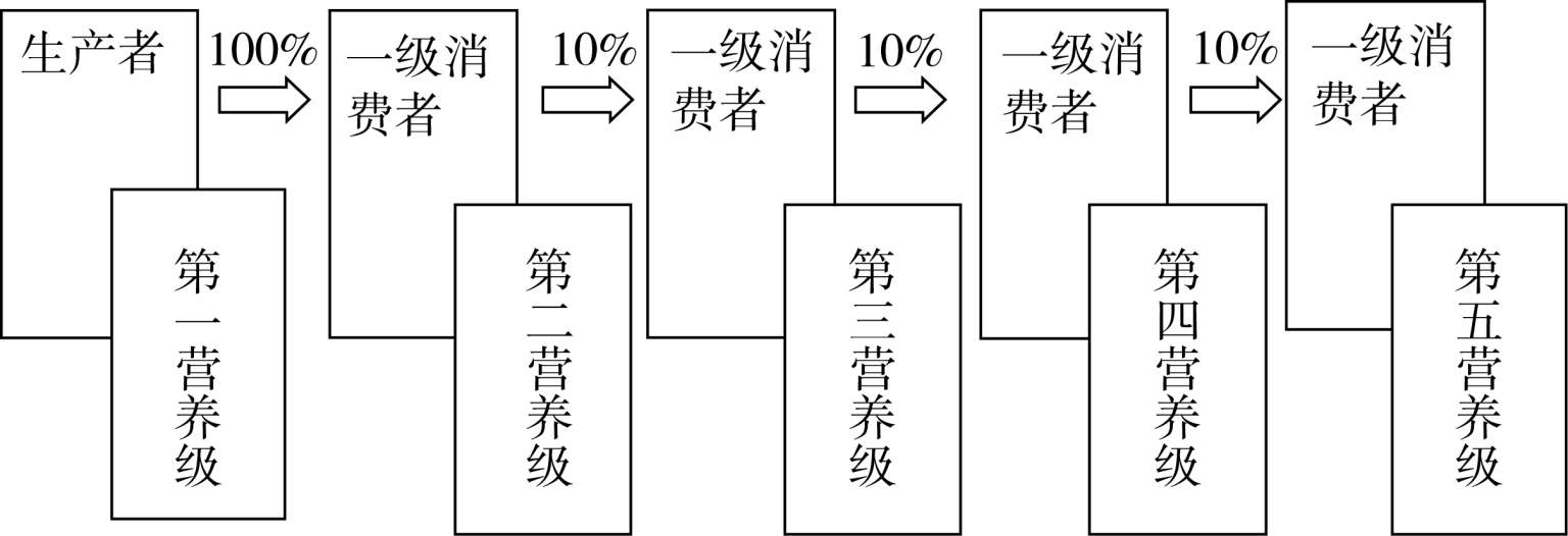 食物链上的每一个环节称为营养级。简单的食物链只有 2 个营养级,通常一个食物链由 4~5 个营养级组成,一般不超过 6级。各营养级上的生物不会只有一种。凡在同一层次上的生物都属于同一营养级。由于食物关系的复杂性,同一生物也不可能隶属于不同的营养级。低位营养级是高位营养级的营养和能量的供应者。但某一级营养级中储存的能量只有 10%左右能被其上一营养级的生物利用。其余大部分能量消耗在该营养级生物的呼吸作用上,并以热量形式释放到环境中,这就是生态学上的 10%定律(如图 2-7 所示)。