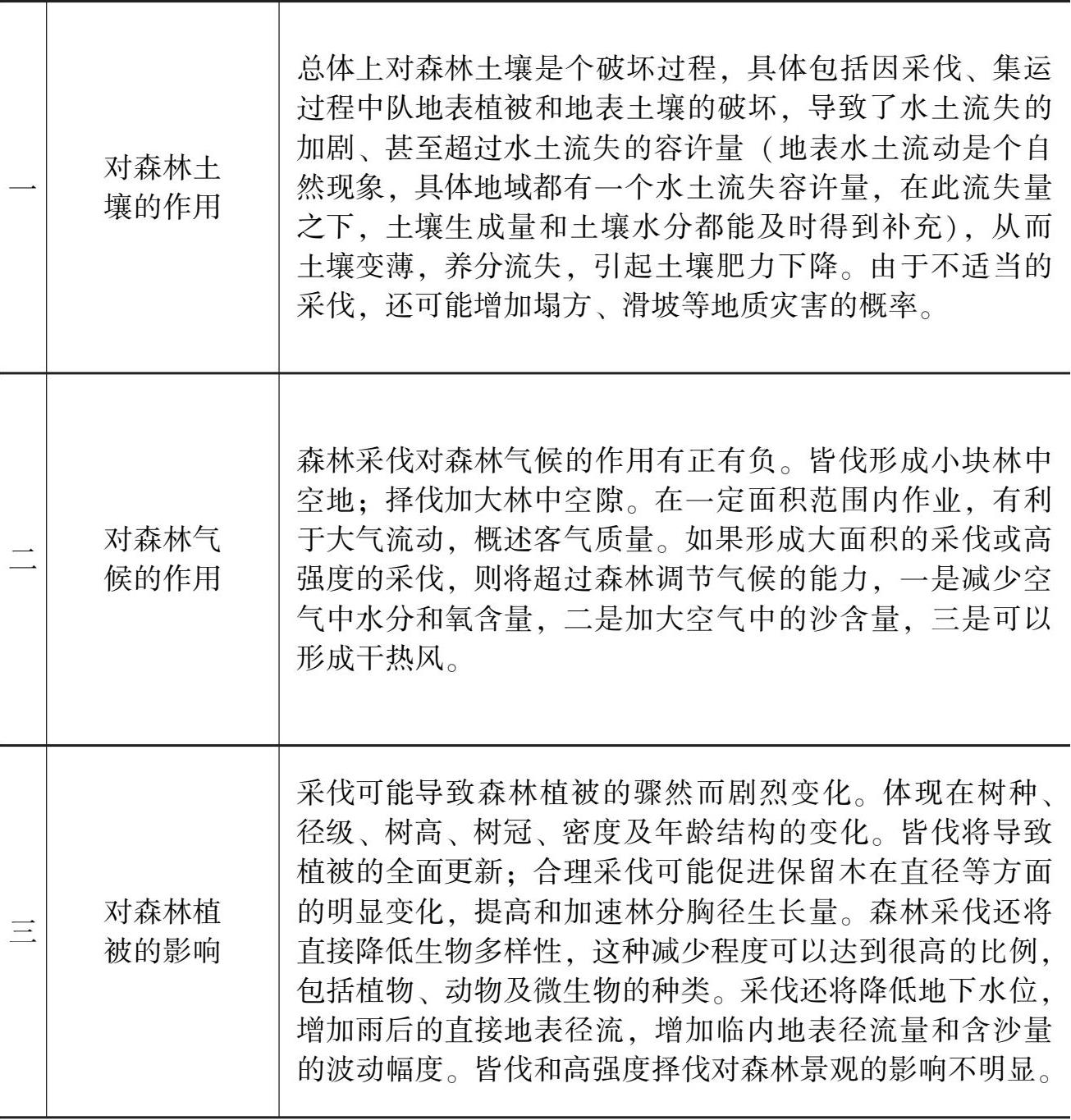 主要有:第一,对森林土壤的作用。总体上对森林土壤是个破坏过程,具体包括因采伐、集运过程中队地表植被和地表土壤的破坏,导致了水土流失的加剧、甚至超过水土流失的容许量(地表水土流动是个自然现象,具体地域都有一个水土流失容许量,在此流失量之下,土壤生成量和土壤水分都能及时得到补充),从而土壤变薄,养分流失,引起土壤肥力下降。由于不适当的采伐,还可能增加塌方、滑坡等地质灾害的概率;第二,对森林气候的作用。森林采伐对森林气候的作用有正有负。皆伐形成小块林中空地;择伐加大林中空隙。在一定面积范围内作业,有利于大气流动,概述客气质量。如果形成大面积的采伐或高强度的采伐,则将超过森林调节气候的能力,一是减少空气中水分和氧含量,二是加大空气中的沙含量,三是可以形成干热风;第三,对森林植被的影响。采伐可能导致森林植被的骤然而剧烈变化。体现在树种、径级、树高、树冠、密度及年龄结构的变化。皆伐将导致植被的全面更新;合理采伐可能促进保留木在直径等方面的明显变化,提高和加速林分胸径生长量;第四,对森林其他因子的影响。森林采伐还将直接降低生物多样性,这种减少程度可以达到很高的比例,包括植物、动物及微生物的种类。采伐还将降低地下水位,增加雨后的直接地表径流,增加林内地表径流量和含沙量的波动幅度。皆伐和高强度择伐对森林景观的影响不明显(如表 2-2 所示)。