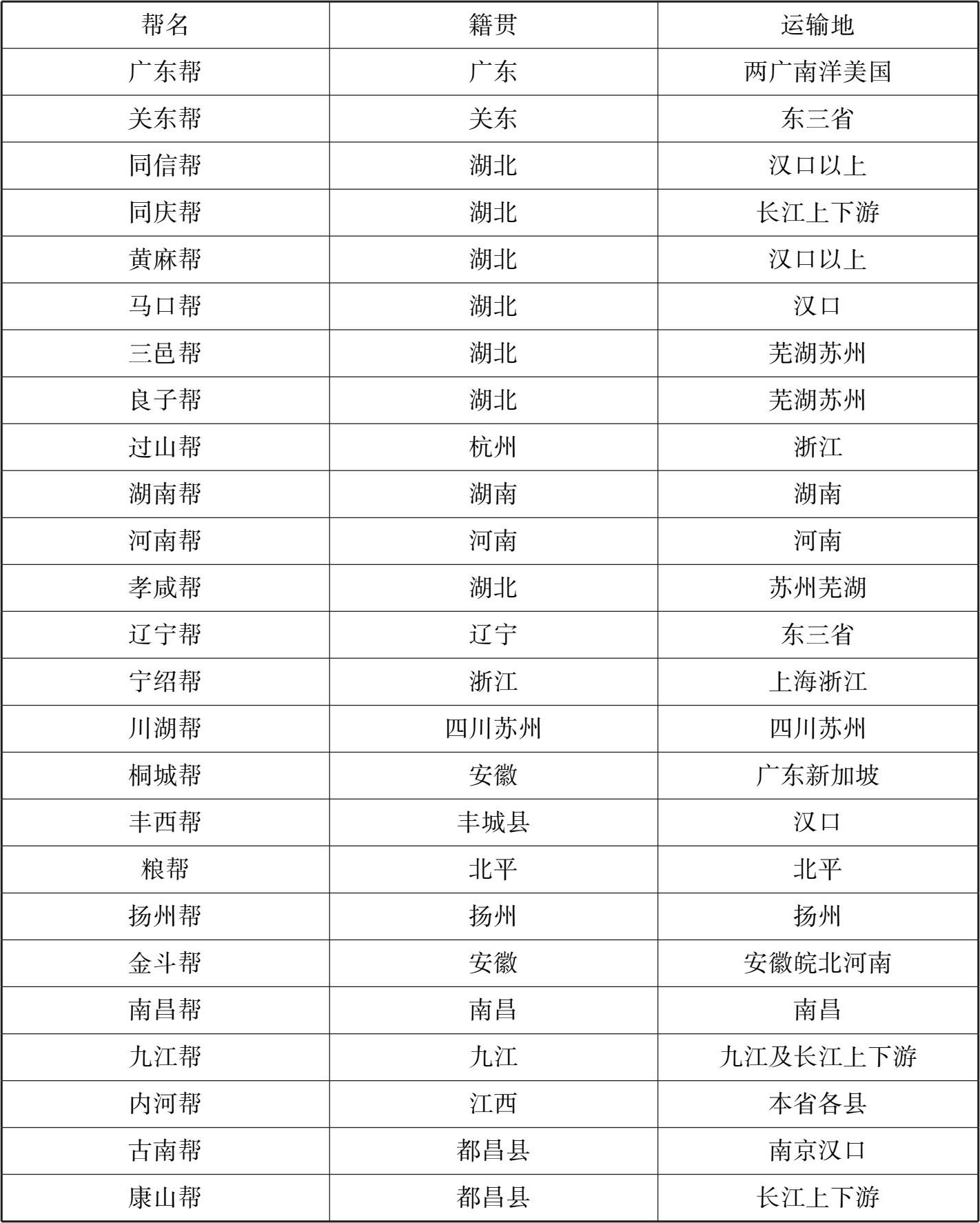 以民国 1947 年江西省的实地调查为例,各帮的从业户数、运销地、产品及数量如图表 1.5 所示: