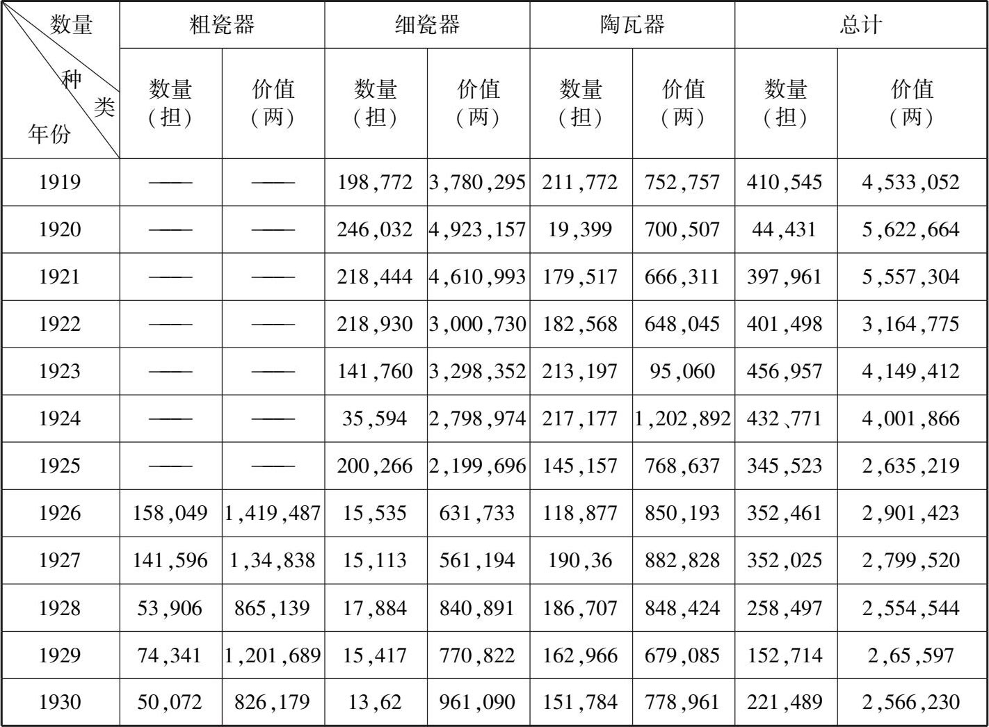 以上数据显示民国早期景德镇运出瓷器量比清末要多,这些数据同样表明民国时期景德镇瓷业生产较前相对稳定,瓷业较为发达,故瓷器外运量相应增长