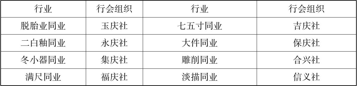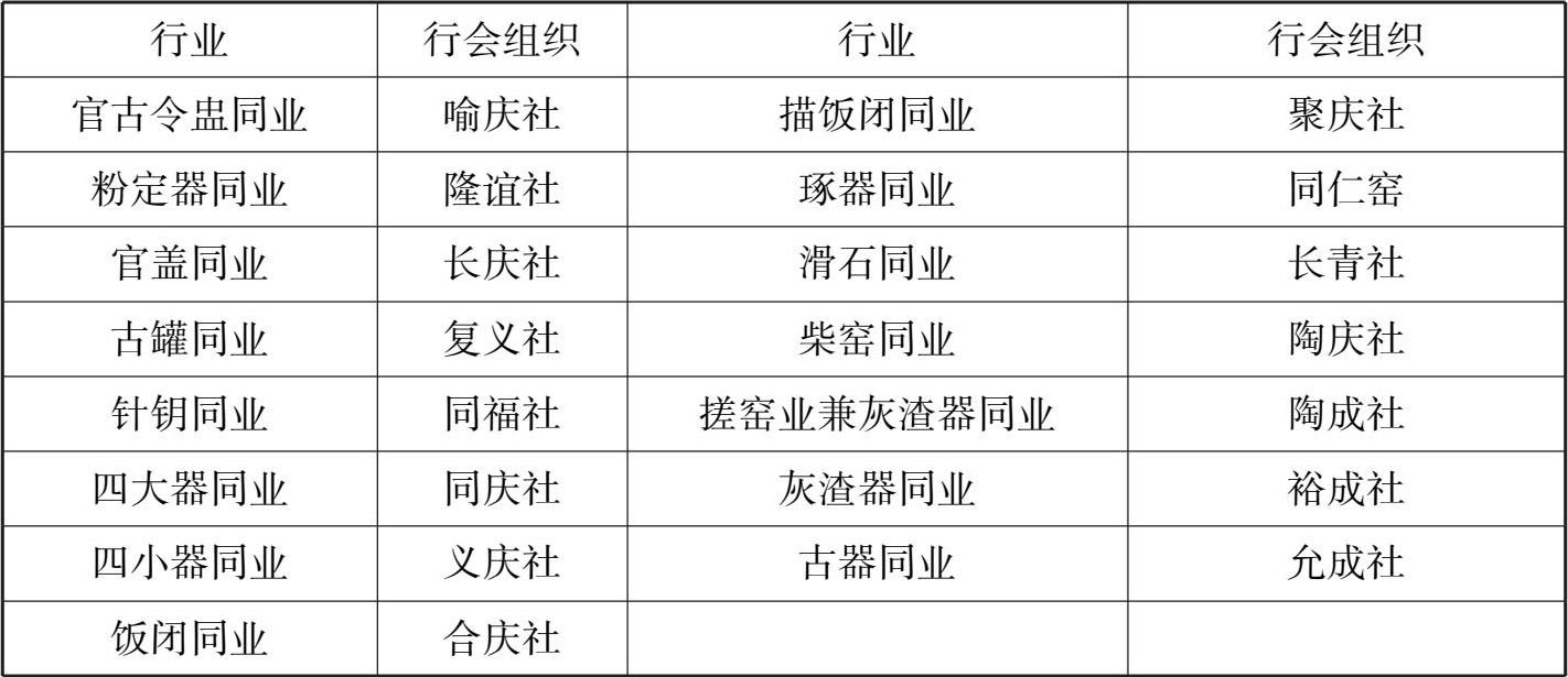 除此之外,还有陶业维持会,管理二白釉、四大器、四小器、冬小器、满尺、七五寸、官古令盅、针钥各业;玉合研究社,管理脱胎、饭闭同业;琢器业研究会,管理大件、粉定、古罐、官盖、滑石、淡描、雕削各业;图画公会,管理彩瓷业;黄家洲瓷业公会,管理黄家洲彩瓷业等