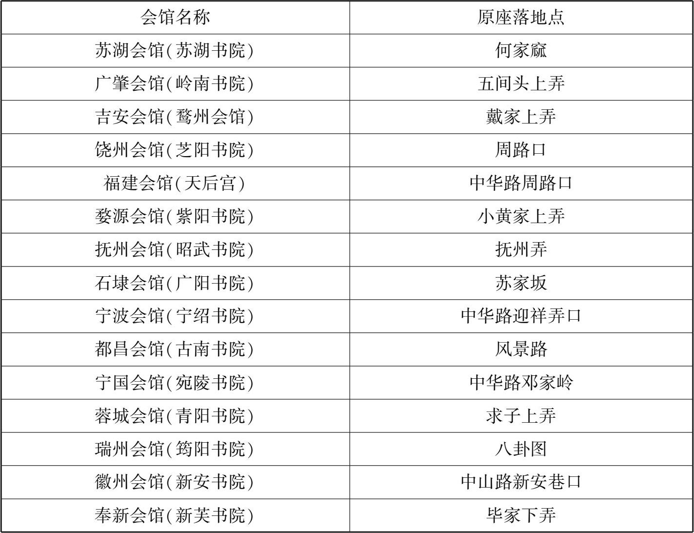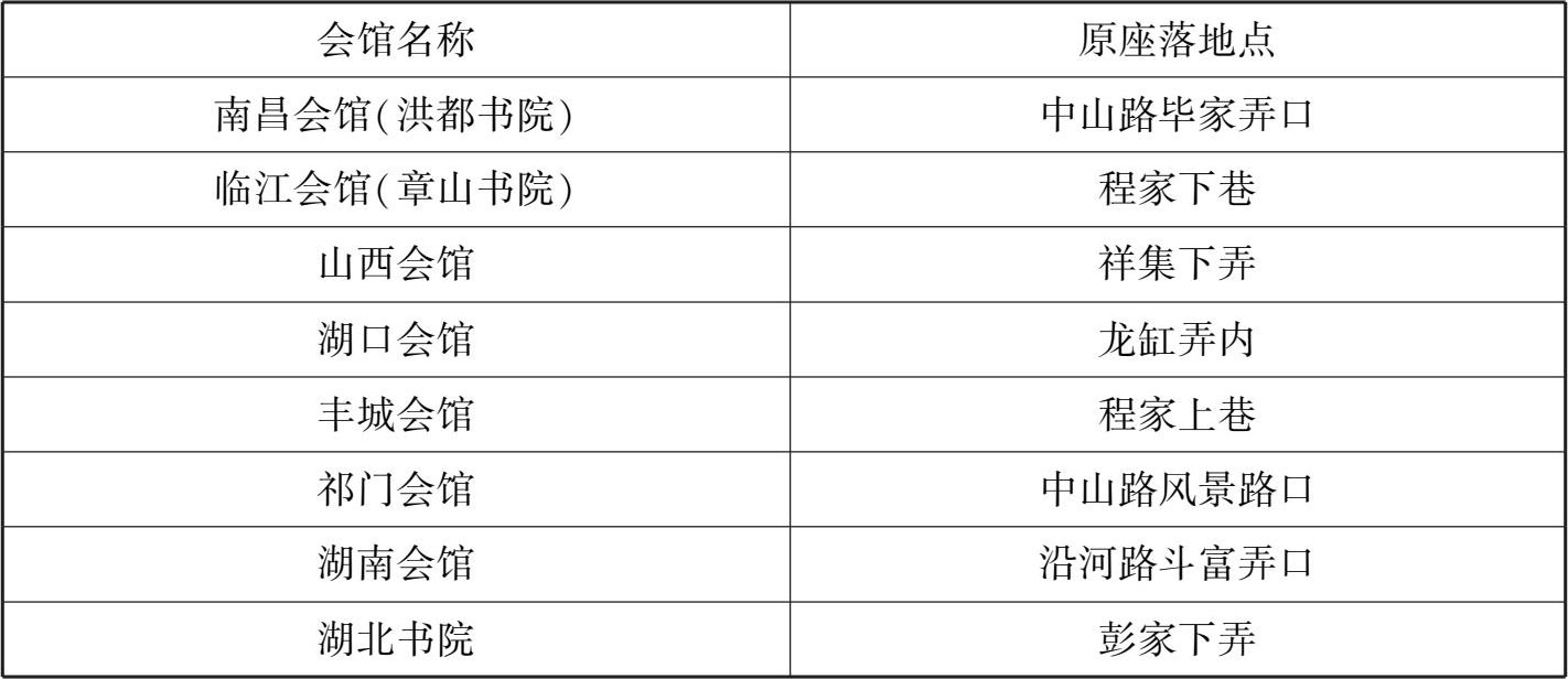 景德镇行帮和商会的广泛活动,促使了会馆的出现和兴盛。(如图 1.6)。会馆,也称书院、公所,它是中国早期都市同乡同业的封建性集团。据文献记载,汉代京师已有外地同乡人的邸舍,南宋杭州有外郡人为同乡谋公益的组织。会馆的名称最早见于明代,清代更盛行,在明清至民国时期会馆是组织各地移民生产、商贸行业经营与活动的重要场所。同时,会馆作为民国时期“商居”与商居文化的重要载体之一,也有它独具的社会功能与价值。更重要的是,随着时代的变迁、商贸方式与范围的改变,会馆的功能也在随之转型。具体而论,则是由单纯的“联络乡谊”、“维护行帮”的功能,向着创建新的“营商环境”、“商居环境”、“商居文化环境”的多元功能转变。