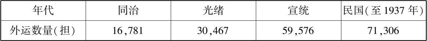 在洋瓷倾销国内市场的同时,景德镇瓷器也有运往国外销售的,尤其是艺术瓷的销售数量较为可观。江西近代史学家吴宗慈在《江西通稿》第二十一册中,辑录了景德镇从清同治二年至第二次世界大战前的逐年外运瓷器数据,笔者根据这些数据计算四个时期的年均量如图表 1.3 所示: