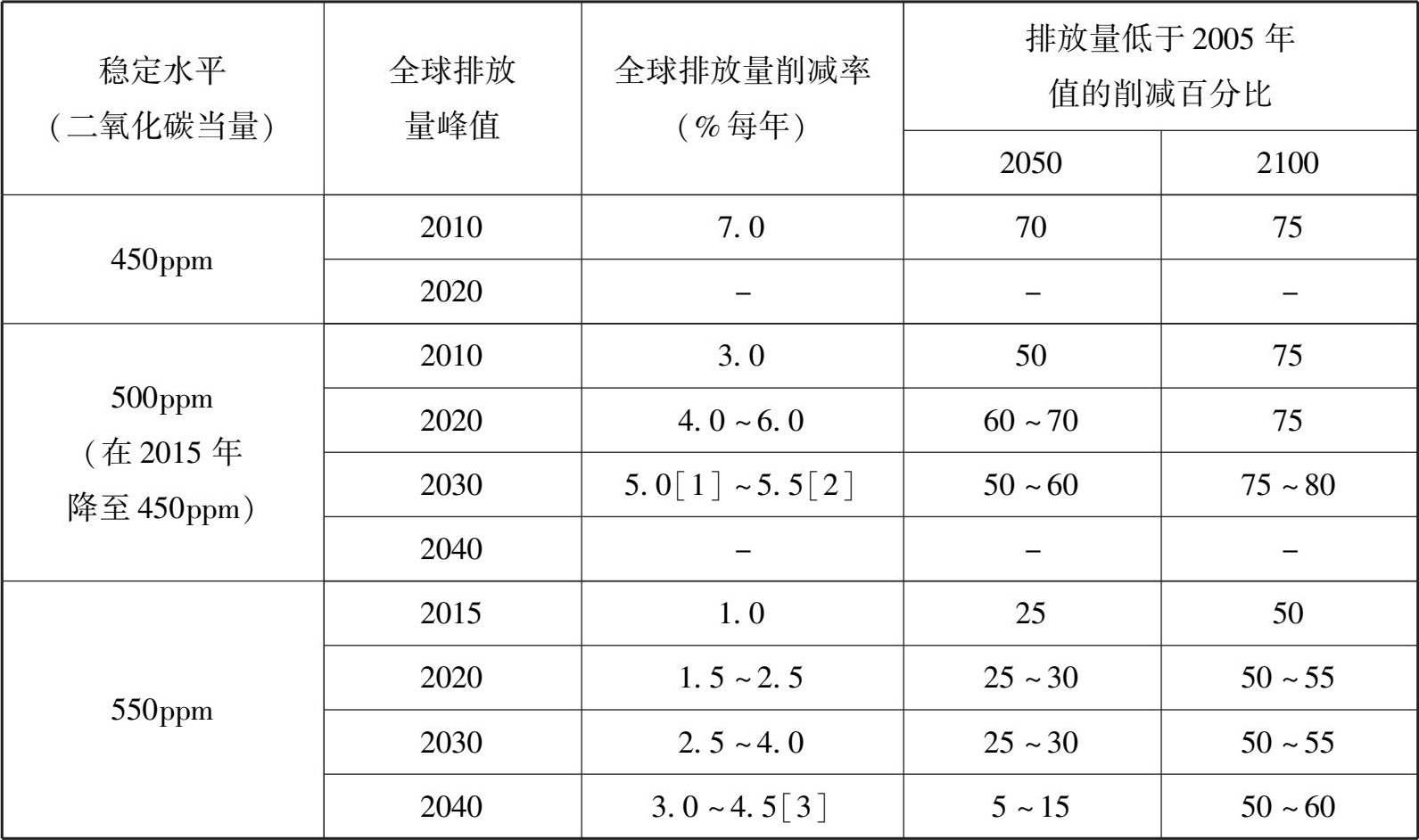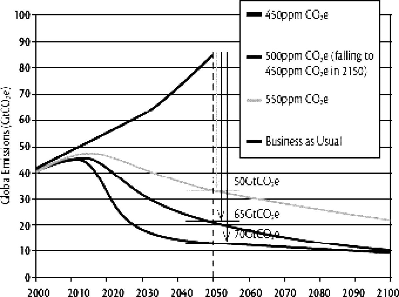 未来工程师的挑战在于,他们不仅要懂得科学、工程和设计问题,还要全面理解如何使国家经济向未来的低排放转变。鉴于全球温室气体排放的快速增长,人们十分有必要意识到紧迫性,把一系列更高水平的措施综合起来,如提供符合成本效益的策略、政策和工程设计,来达到全球气体稳定排放的目标。《斯特恩报告》仔细探讨了稳定轨迹的概念并指出了两个截然不同的方面:1.全球排放量需要停止增长,也就是说排放量达到一个顶峰并开始减少;2.纵观整个世界经济,需要持续减少每年温室气体的排放量。《斯特恩报告》宣称“不能再拖延行动了,否则会越来越困难。如果把 2020 年的全球排放量最大值推迟到 2030 年,那么想要把二氧化碳当量稳定在 550ppm,就需要把每年排放量减少的比率增加几乎一倍。这十年的拖延将会使得把二氧化碳当量稳定在 550ppm变得不切实际,除非在排放量到达最大值之前,人们先一步采取行动,使排放量的增长大幅放缓”