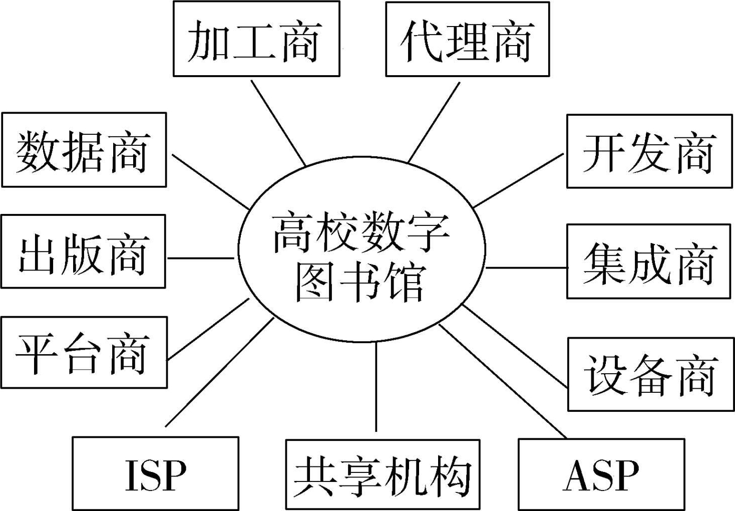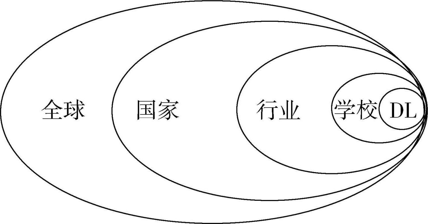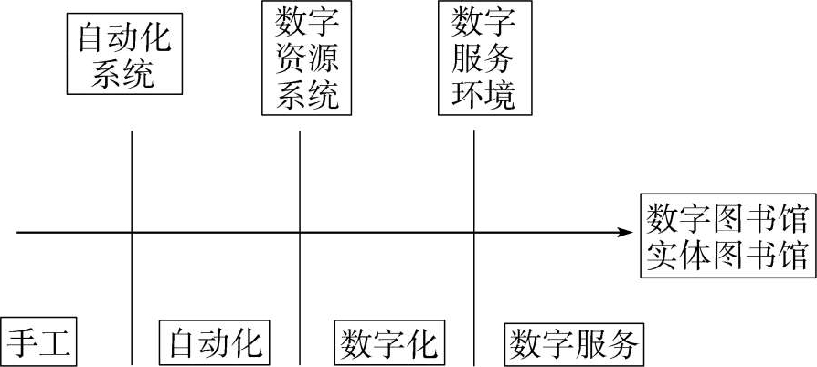 图2-2 中,描绘高校图书馆经历手工、自动化、数字化、数字服务这样一个发展过程,此过程中,自动化系统是手工与自动化的分界点;数字资源系统是自动化与数字化的分界点;数字服务环境是数字化与数字服务的分界点。高校图书馆当前处于数字图书馆与实体图书馆并存的“复合型图书馆”阶段。