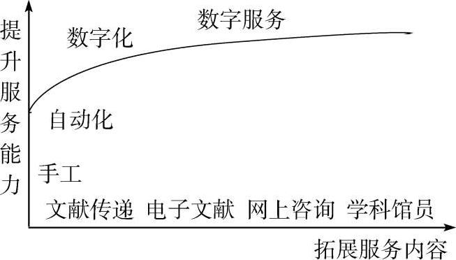 图2-1 中,描绘高校图书馆经历手工、自动化、数字化、数字服务这样一个发展过程,揭示此过程在提升服务能力和拓展服务内容所产生的影响。