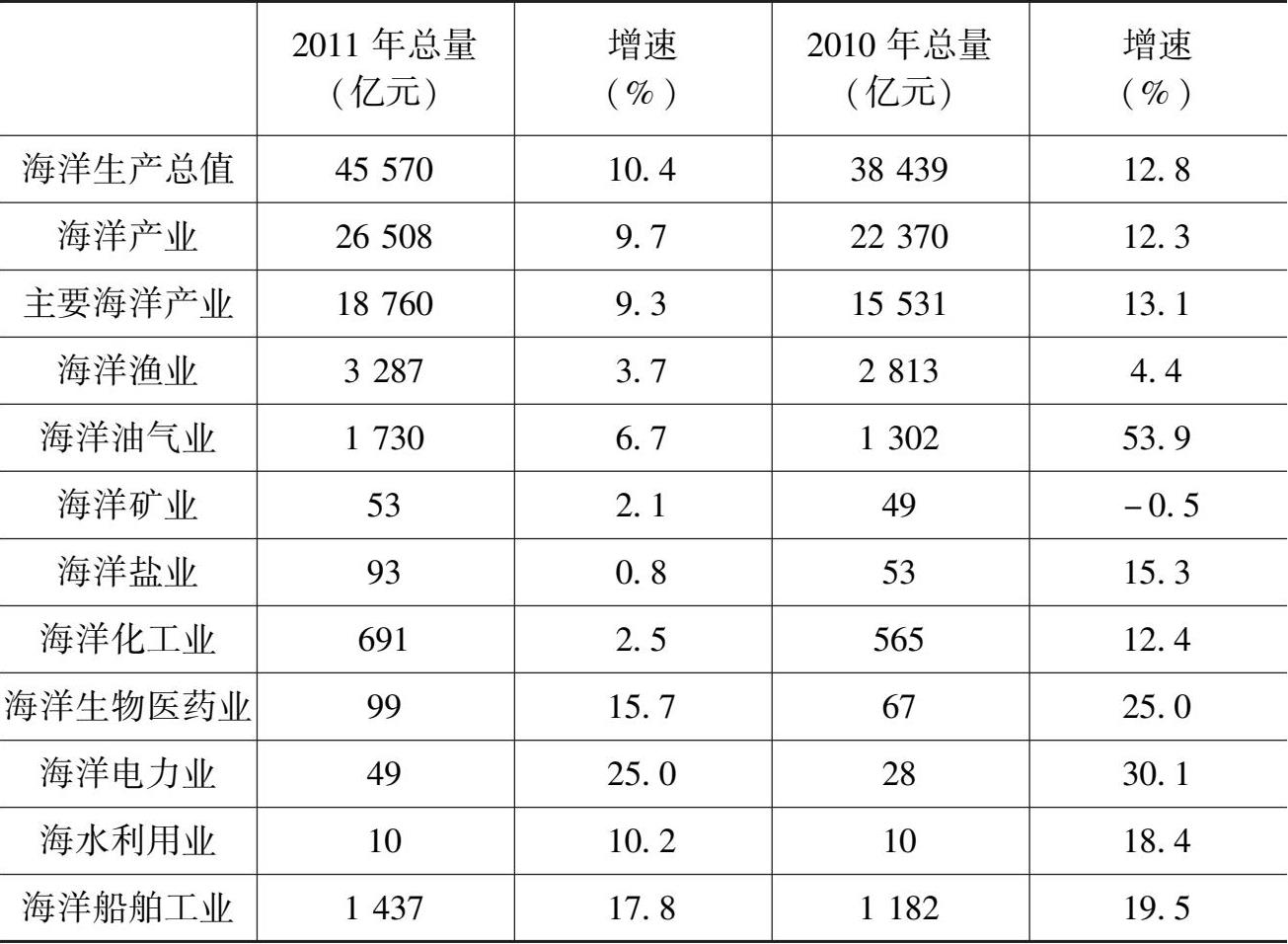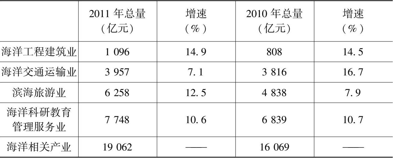 从产业的增长速度看,表4.1显示,2010年和2011年连续两年增长速度保持在10%以上的主要海洋产业包括海洋生物医药业、海洋电力业、海水利用业、海洋船舶工业和海洋工程建筑业。