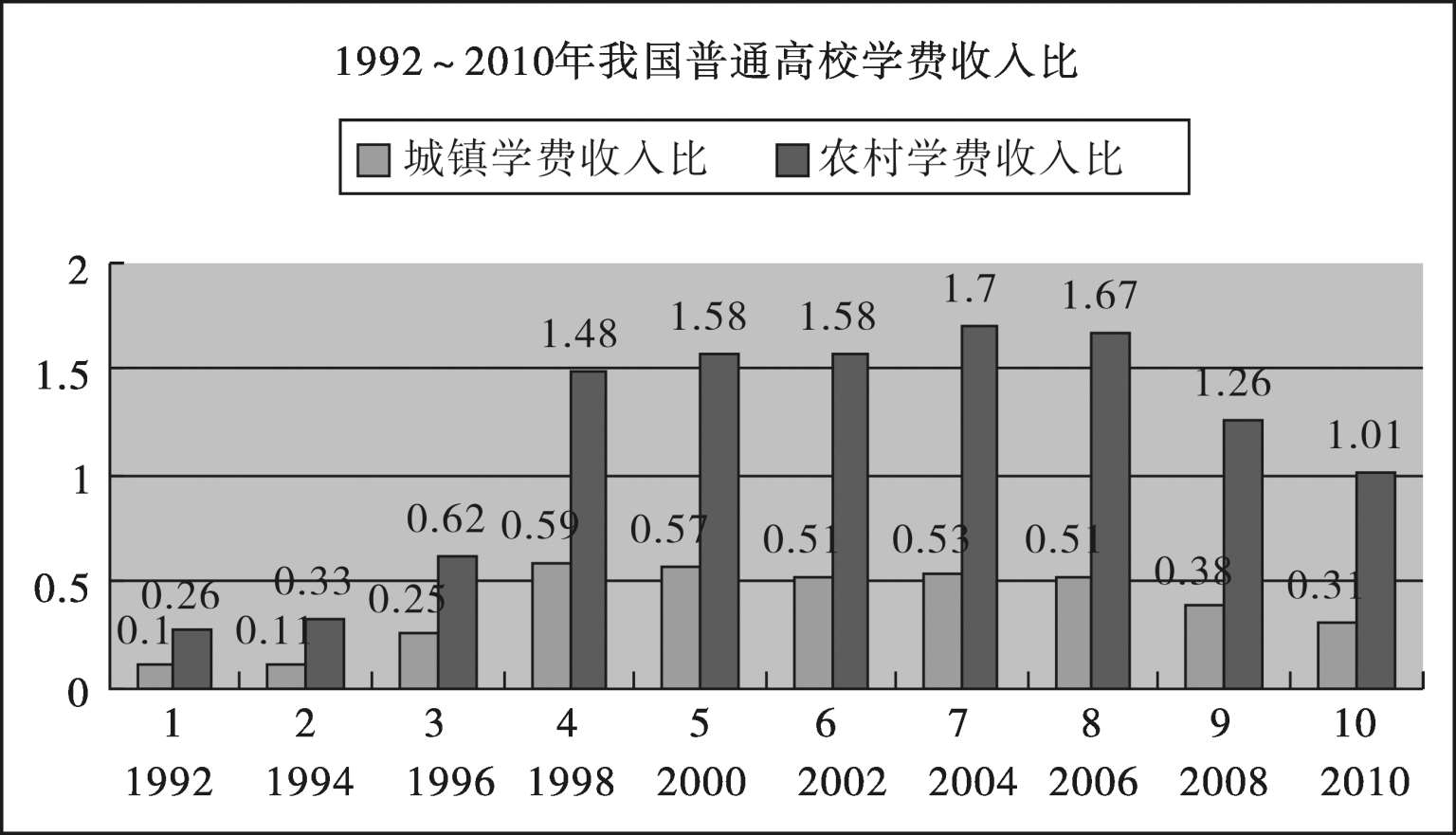 图 1—7 1992 ~ 2010 年我国城镇和农村的高等教育学费收入比