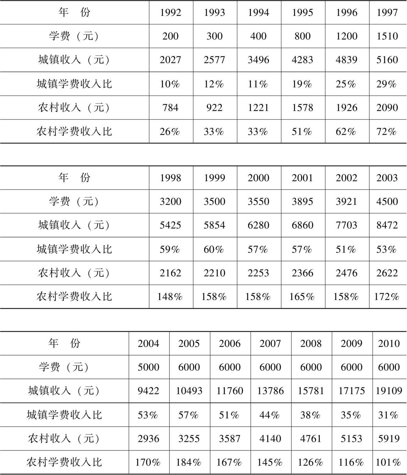 表 1—6 1992 ~ 2010 年我国城镇和农村的学费收入比