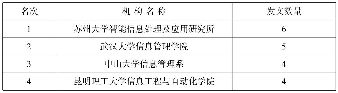 发文量前四位的作者机构,如表 13 所示。可见,隐蔽网络领域已形成一些研究机构的雏形,且主要集中在高校的信息管理系和信息工程与信息处理研究所,如苏州大学智能信息处理及应用研究所、武汉大学信息管理学院、中山大学信息管理系和昆明理工大学信息工程与自动化学院。