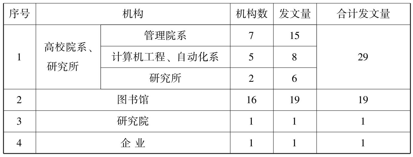 2.著者机构分类统计。按机构性质不同将论文著者的机构分为高校院系、图书馆、研究院和企业进行统计,如表 12 所示。表 12 表明,高校院系的发文量是最多的,达 29 篇,占 58%,此数据包括高校的管理院系、研究所和计算机工程与自动化系;图书馆发文次之,均为高校图书馆,达19 篇,可见高校是隐蔽网络研究的主体。高校的计算机工程、自动化院系的研究主要是技术上的,但其他单位的研究大多集中在理论层面上,缺少实践经验。