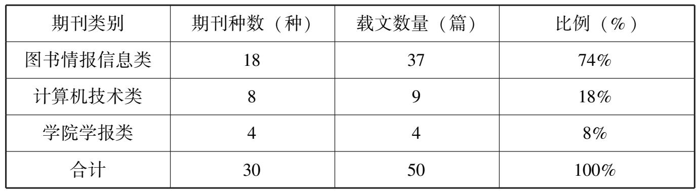 1.期刊类型分布。据统计,50 篇论文分布于 30 种期刊中,其期刊种类分布如表 6。